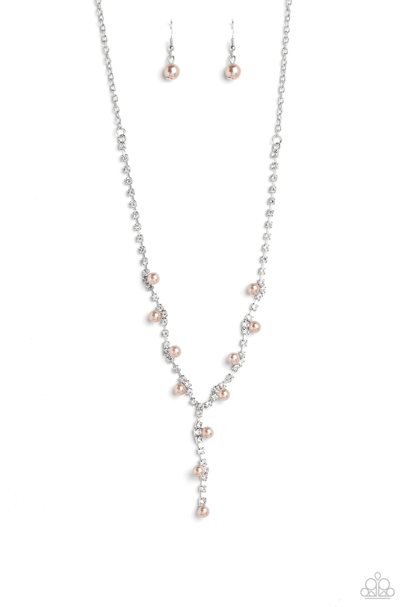 Attached to a section of dainty silver links, white rhinestones, pressed into shiny silver box chain fittings swing down the neckline in a lariat-like manner for an effulgent glow. Sporadically infused along the box chain fittings, high-sheen iced coffee pearls adorn the sparkly display for additional refinement and class. Features an adjustable clasp closure.