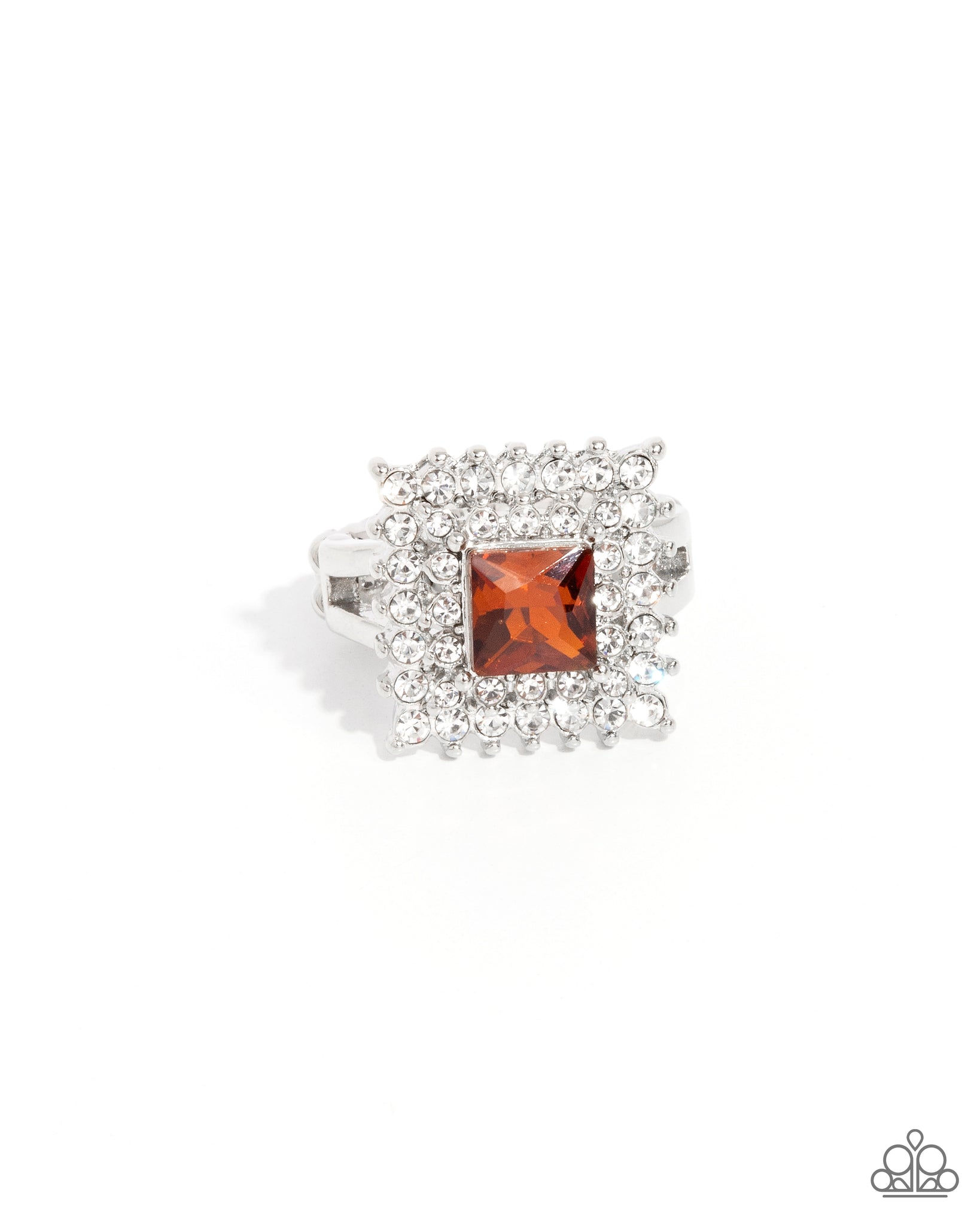 Featuring a faceted tea square-cut gem, a thick silver frame embellished with layers of varying sizes of white rhinestones glistens atop the finger for a standout, sparkly centerpiece. Features a stretchy band for a flexible fit.