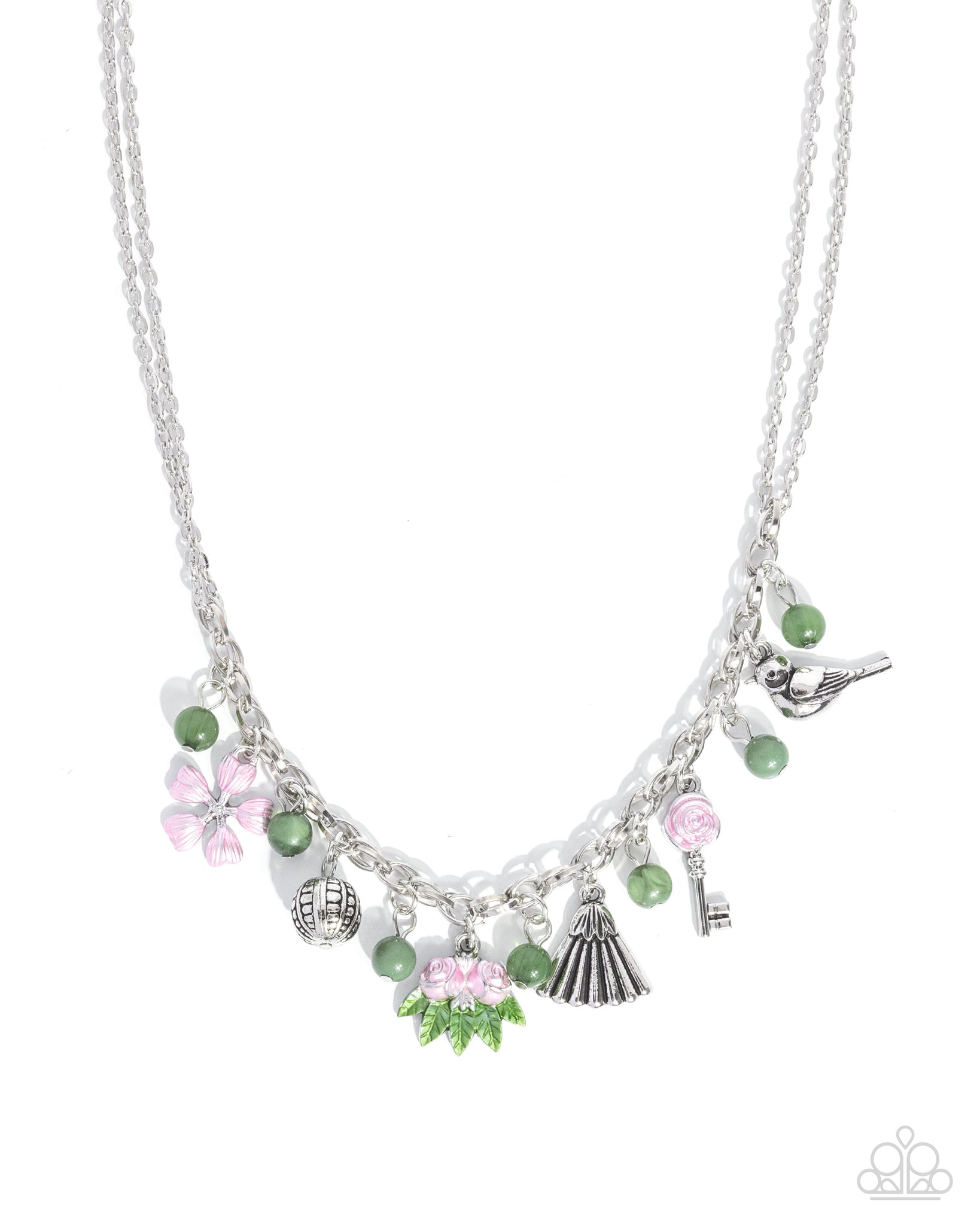 Connecting to duos of silver chains, a double-layered silver chain coalesces below the neckline where charismatically whimsical charms cascade, including Kashmir beads in varying opacities, a silver bird, a pearly baby pink rose-topped silver key, a silver fan, a duo of pearly baby pink roses with green leaves, a textured silver ornament, and a pearly baby pink textured flower. Features an adjustable clasp closure.