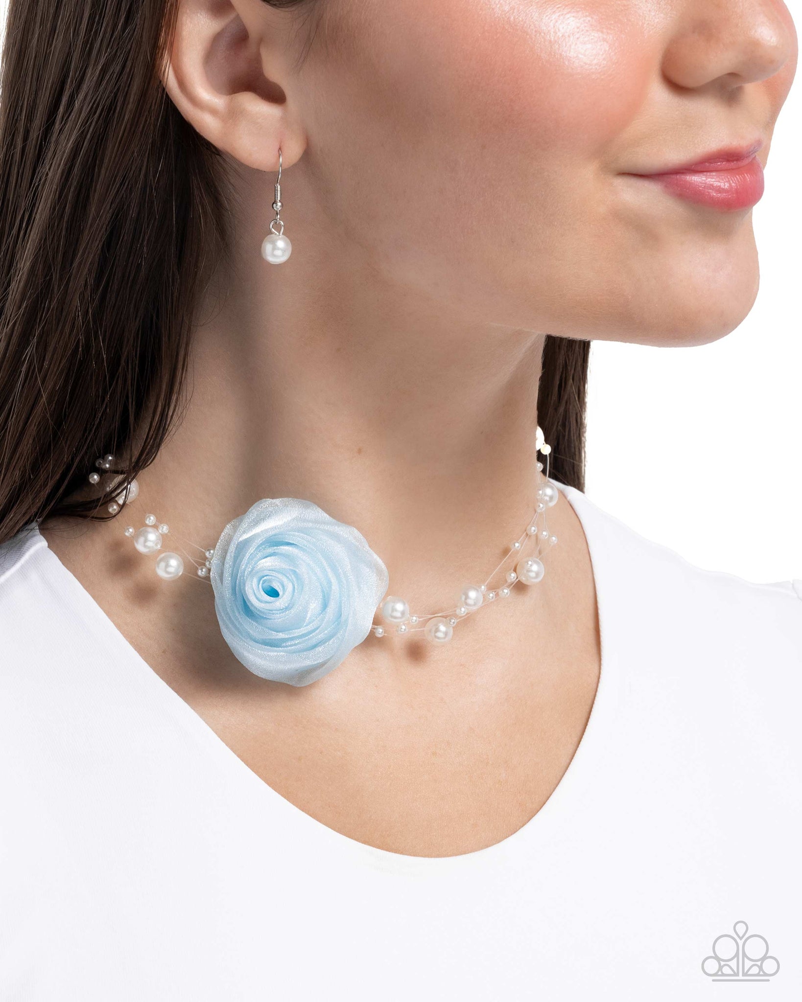 Infused along copious, dainty silver wires, an exaggerated display of white pearls in varying sizes elegantly sweeps below the collar. A sparkly Winter Sky tulle rose blooms along the center of the regal piece, adding over-the-top whimsicality to the unapologetic pearl palette. Features an adjustable clasp closure.