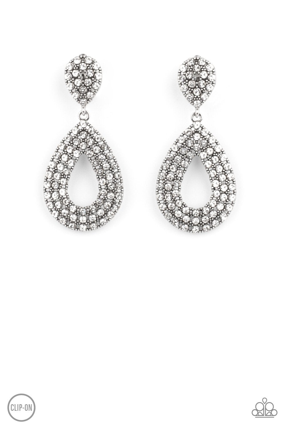 A white rhinestone encrusted silhouette teardrop attaches to the bottom of a dainty white rhinestone encrusted teardrop, creating a glamorous lure. Earring attaches to a standard clip-on fitting.