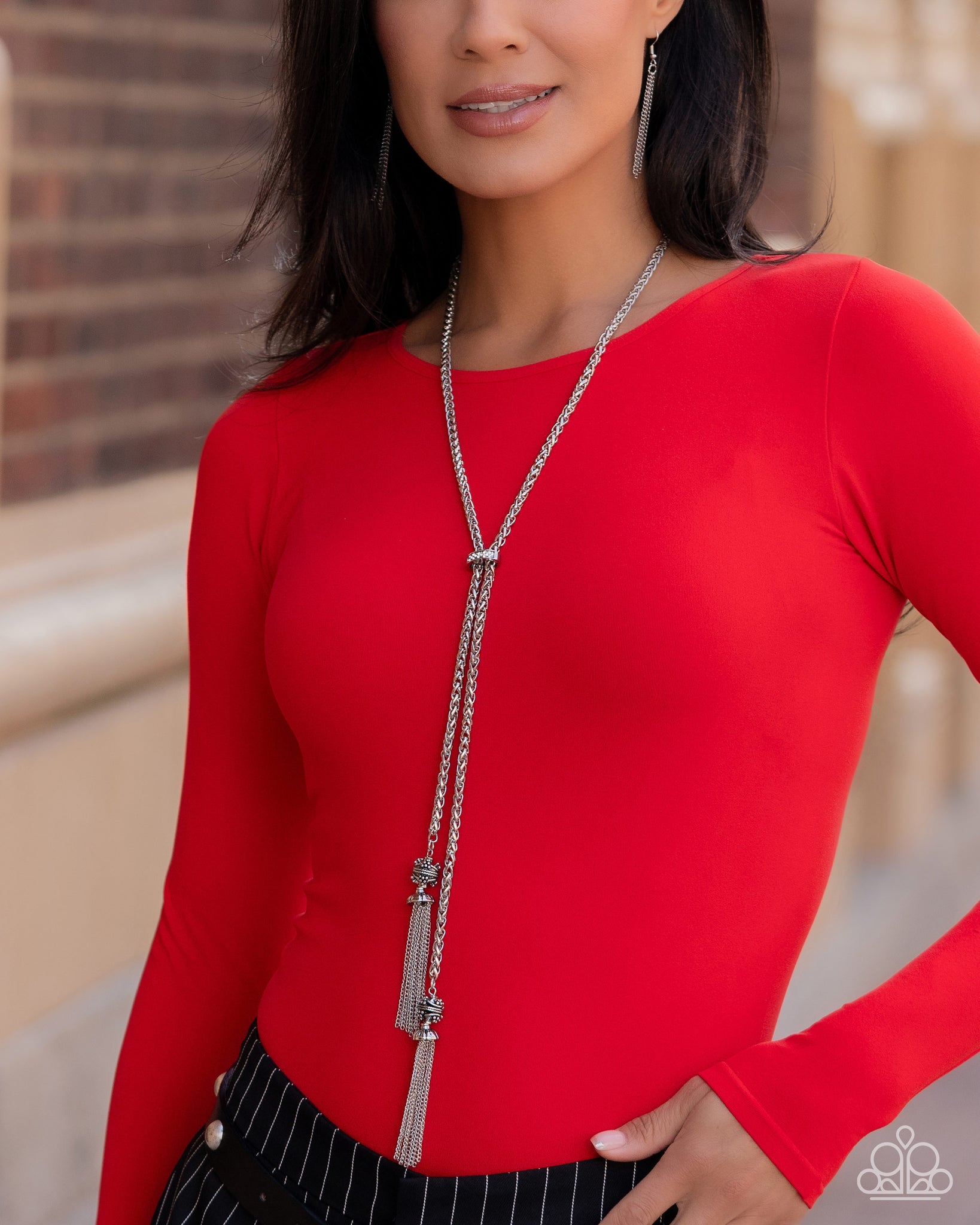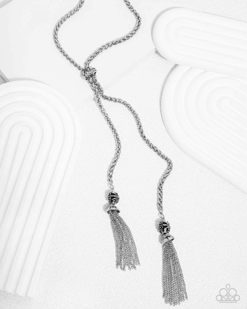 Featuring a dainty dusting of white rhinestones, a curved silver pendant slides along bold silver chained strands leading the eye to silver-studded and rope-textured silver ornaments and glistening silver chained tassels, creating a pendant full of attitude. Features an adjustable clasp closure.