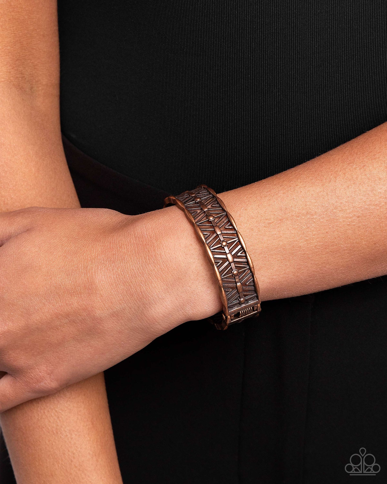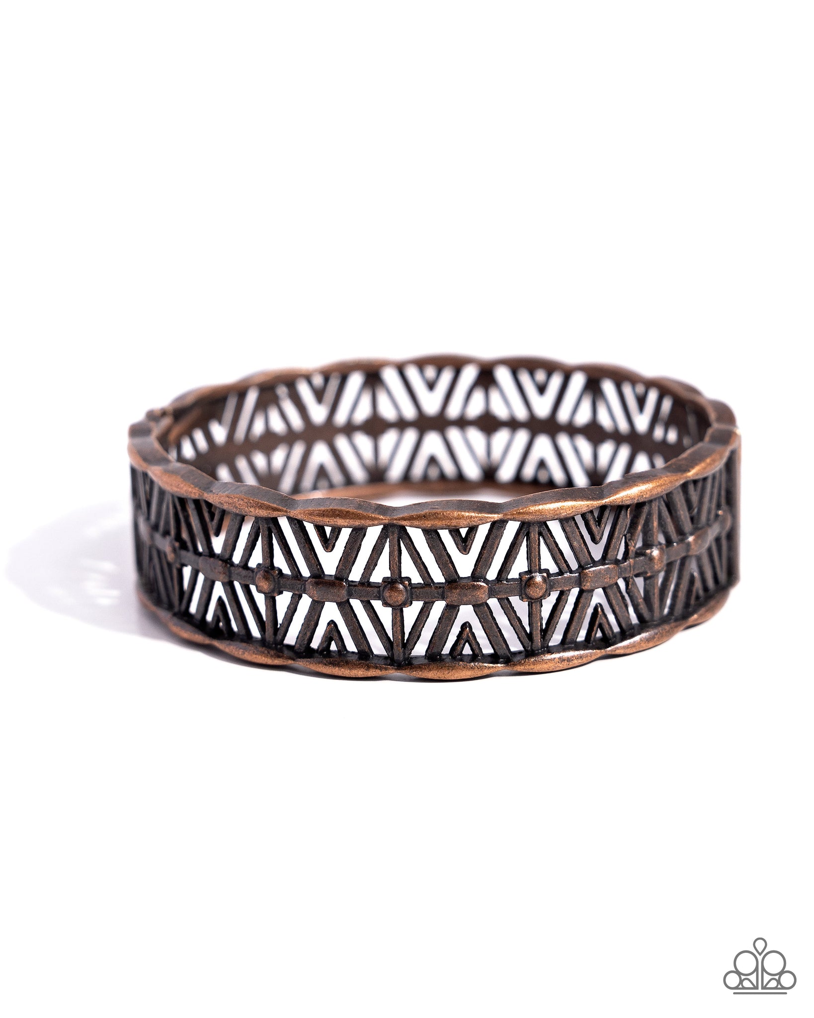 Filled with studded copper detail and airy geometric patterns, two rustic copper frames delicately connect into an edgy and stackable bangle-like bracelet. Features a hinged closure.