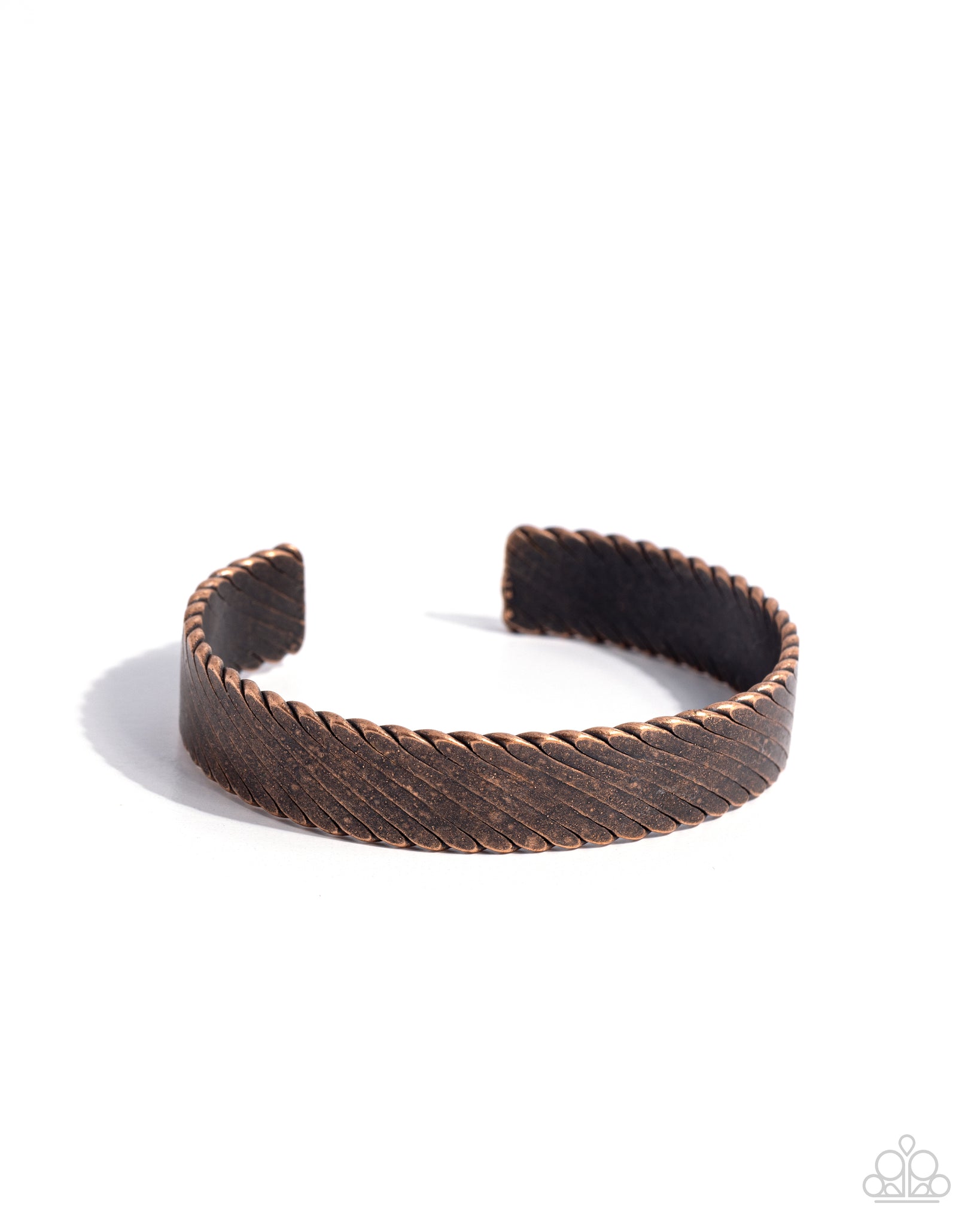 Flattened copper bars slant across the front of a ruggedly scalloped copper cuff, resulting in an edgy centerpiece around the wrist.