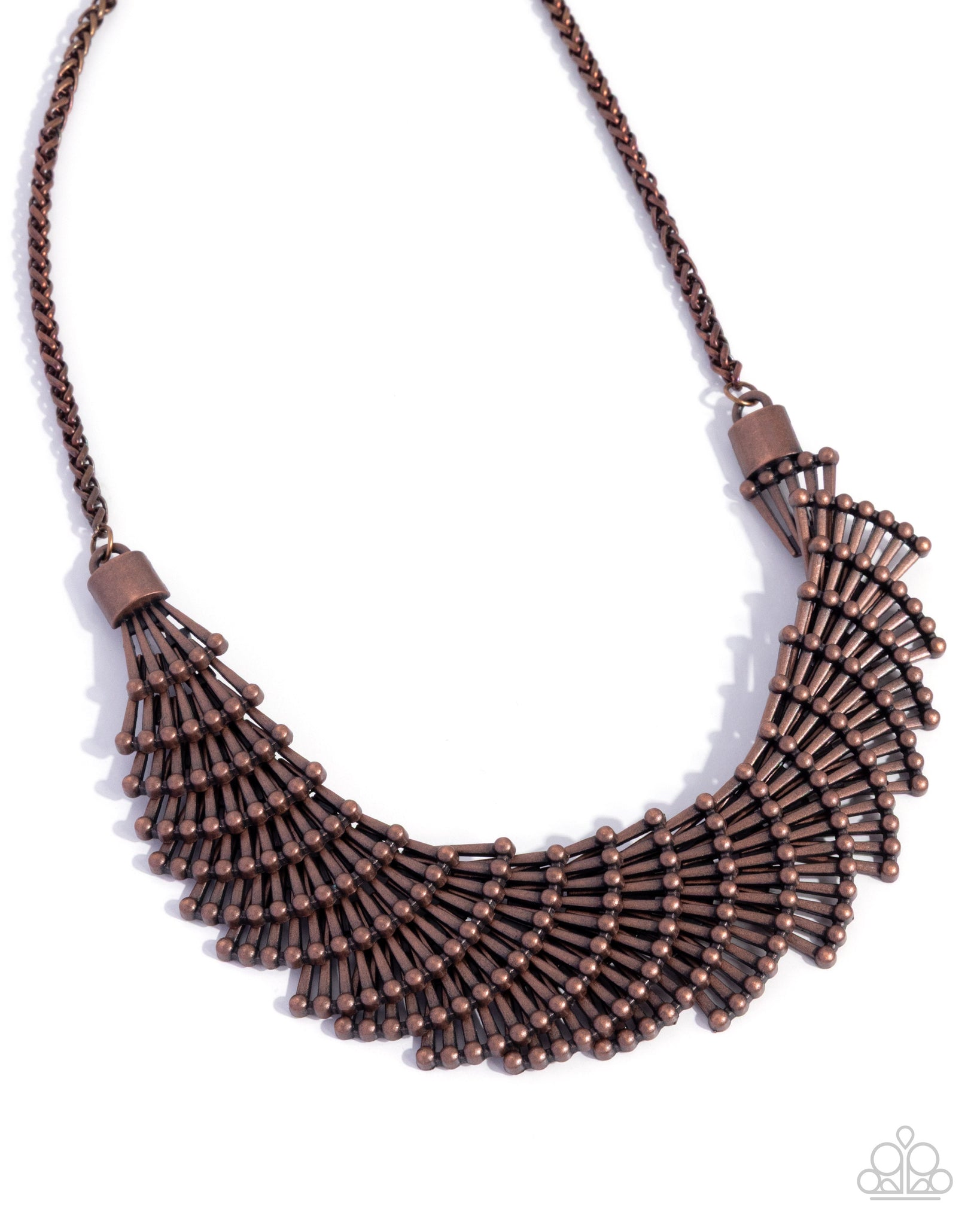 Giving way from a braided copper chain, a collection of copper-capped, fanned frames gradually increases in dimension from copper cap fittings, delicately overlapping below the collar, creating an edgy optical illusion. Features an adjustable clasp closure.