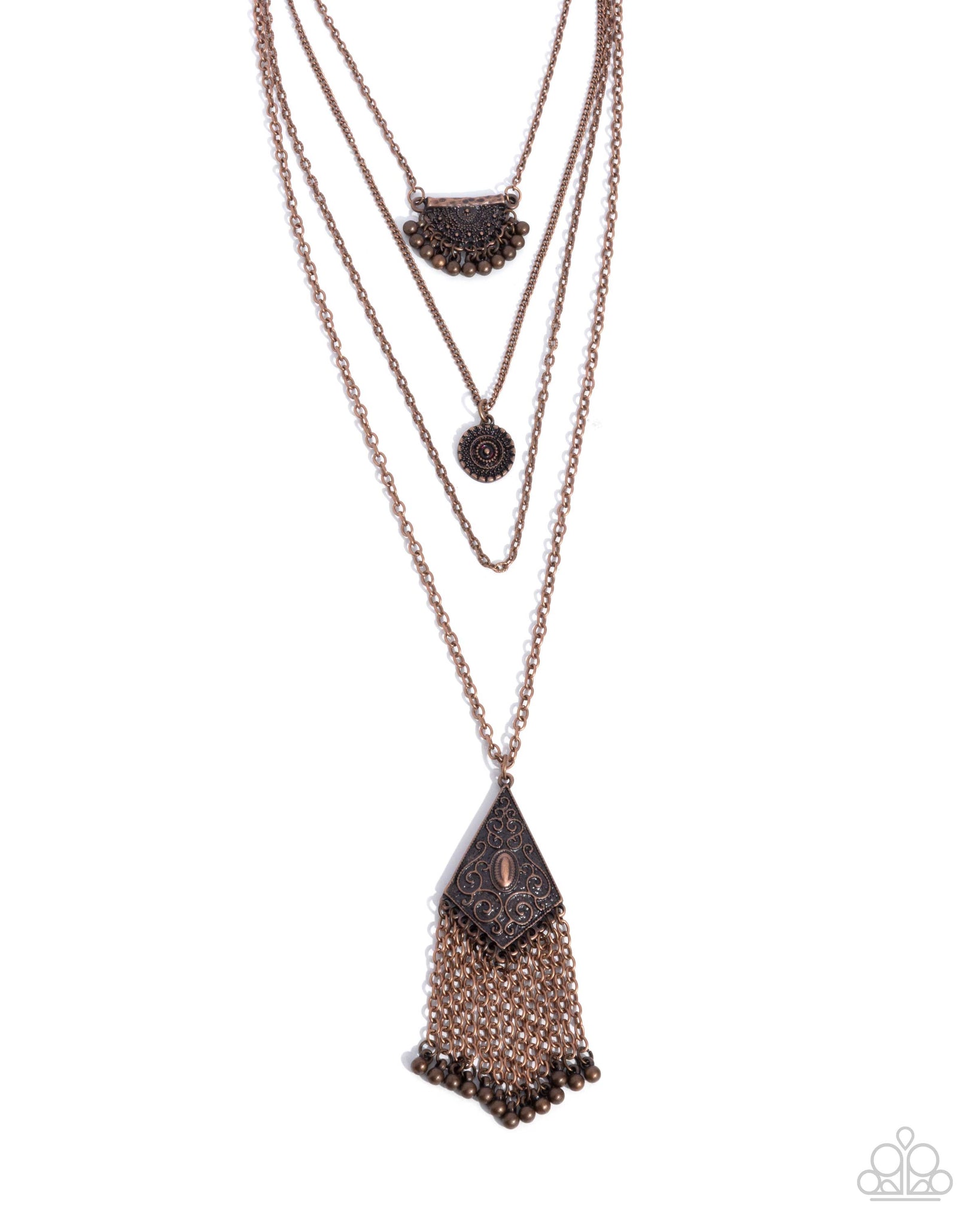 A mismatched quartet of copper chains, including classic, abstract, cable, and dainty cable chains layers down the chest. Featuring psychedelic-inspired studded motifs, a half-circle copper pendant, complete with swaying copper studs adorns the uppermost chain while a spiral-studded copper pendant graces the second uppermost chain. The third chain features subtle texture while an oversized kite-shaped pendant, embellished with curly whimsical filigree swings from the lowermost chain. A curtain of classic copper chains with studs at its ends cascades from the lowermost pendant for an eye-catching finish. Features an adjustable clasp closure.