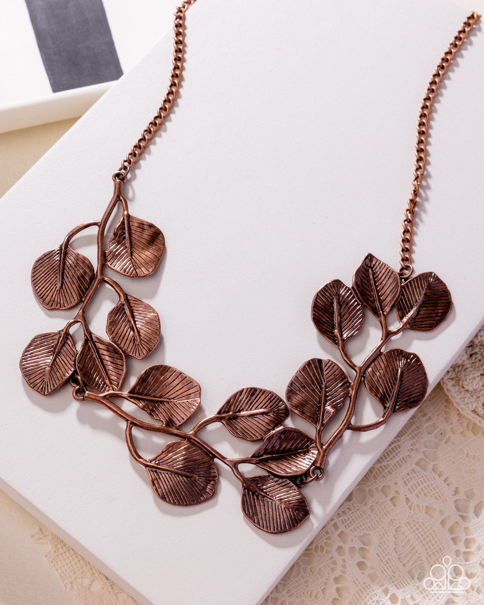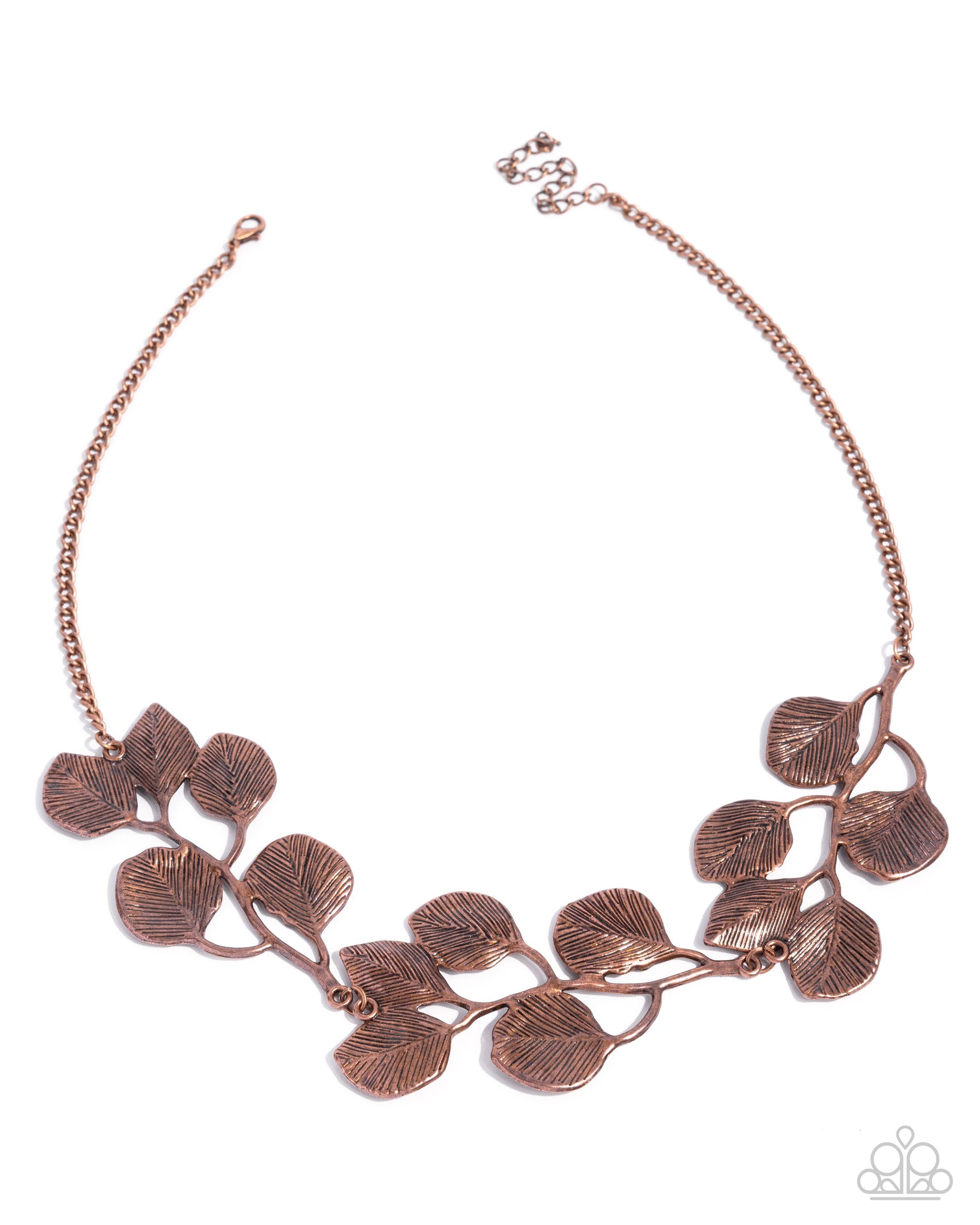 Embossed in life-like detail, branches of copper leaves delicately fan out below the neckline from a classic copper chain for a whimsical statement-making look. Features an adjustable clasp closure.