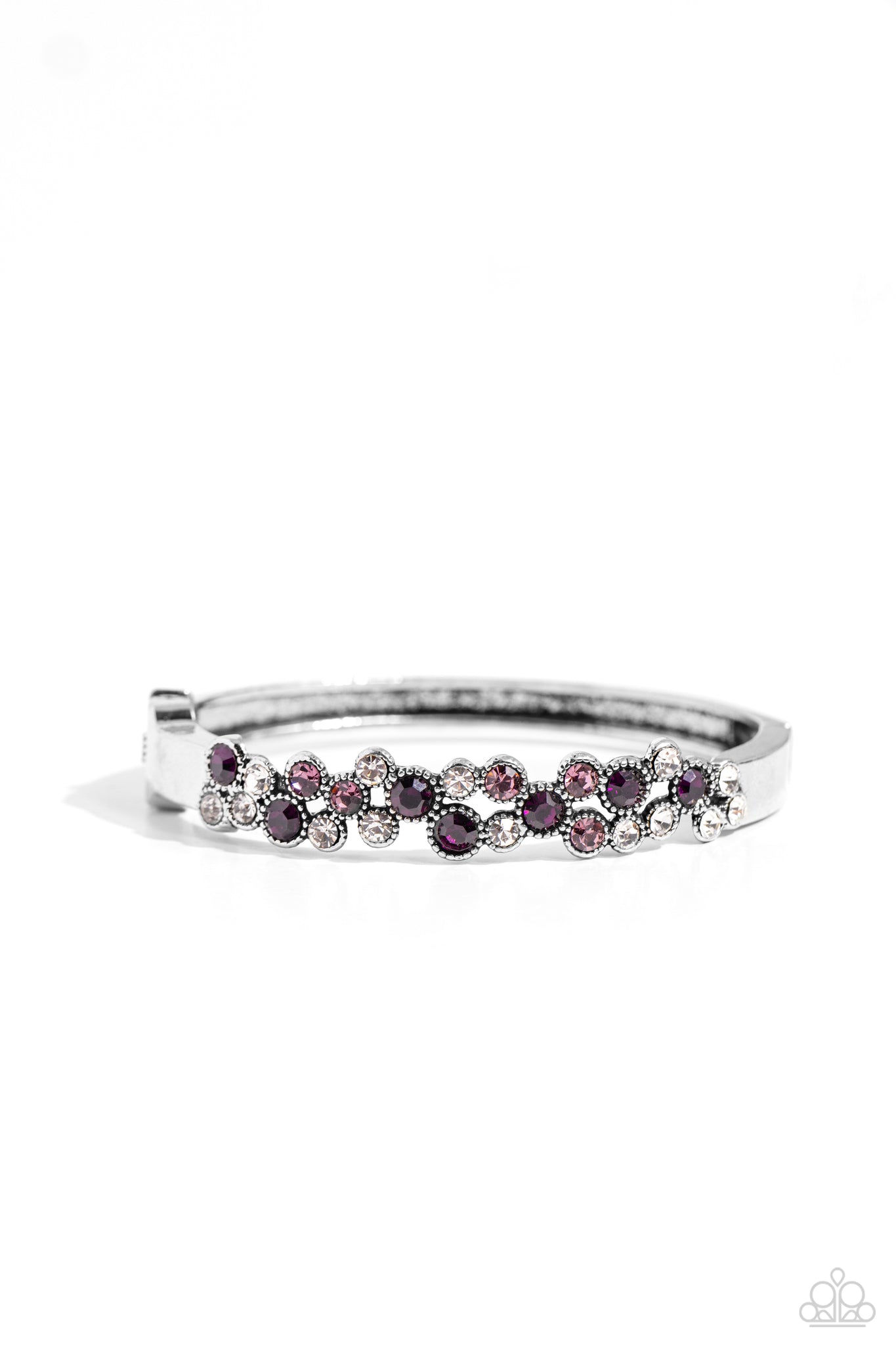 Featuring a crisscross pattern, a studded, framed collection of gems in varying sizes in shades of purple and white coalesce the top of a thick, silver bracelet for a pop of shimmery color atop the wrist. Features a hinged closure.
