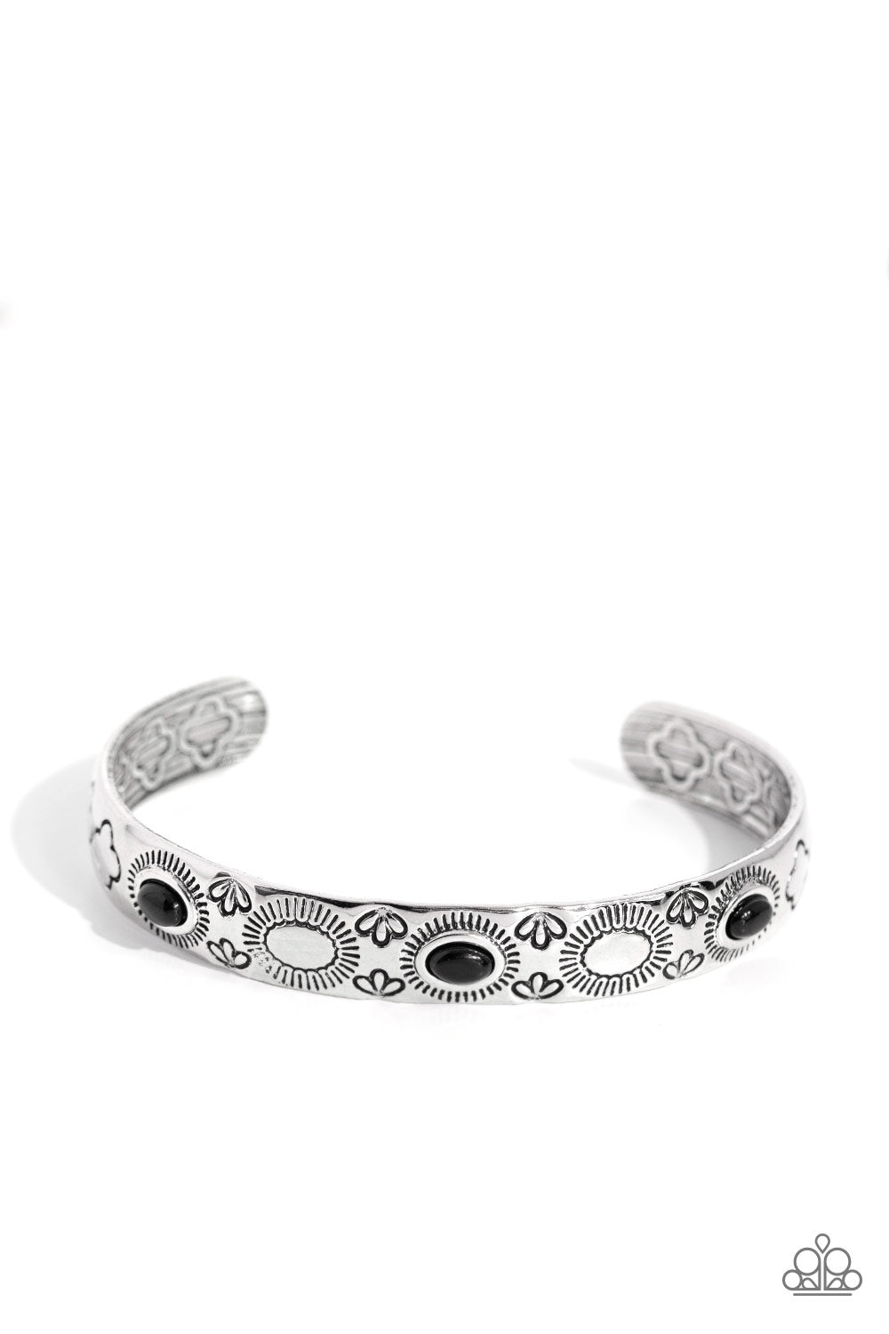 A trio of oval black beads are pressed into the centers of shimmery sunbursts stamped across the front of a dainty silver cuff radiating with desert patterns, creating an earthy pop of color around the wrist.