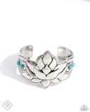 Inspired by a Lotus flower, a thick, oversized silver cuff is dotted with a collection of turquoise stones for a seasonal, earthy look. As the stone elements in this piece are natural, some color variation is normal.