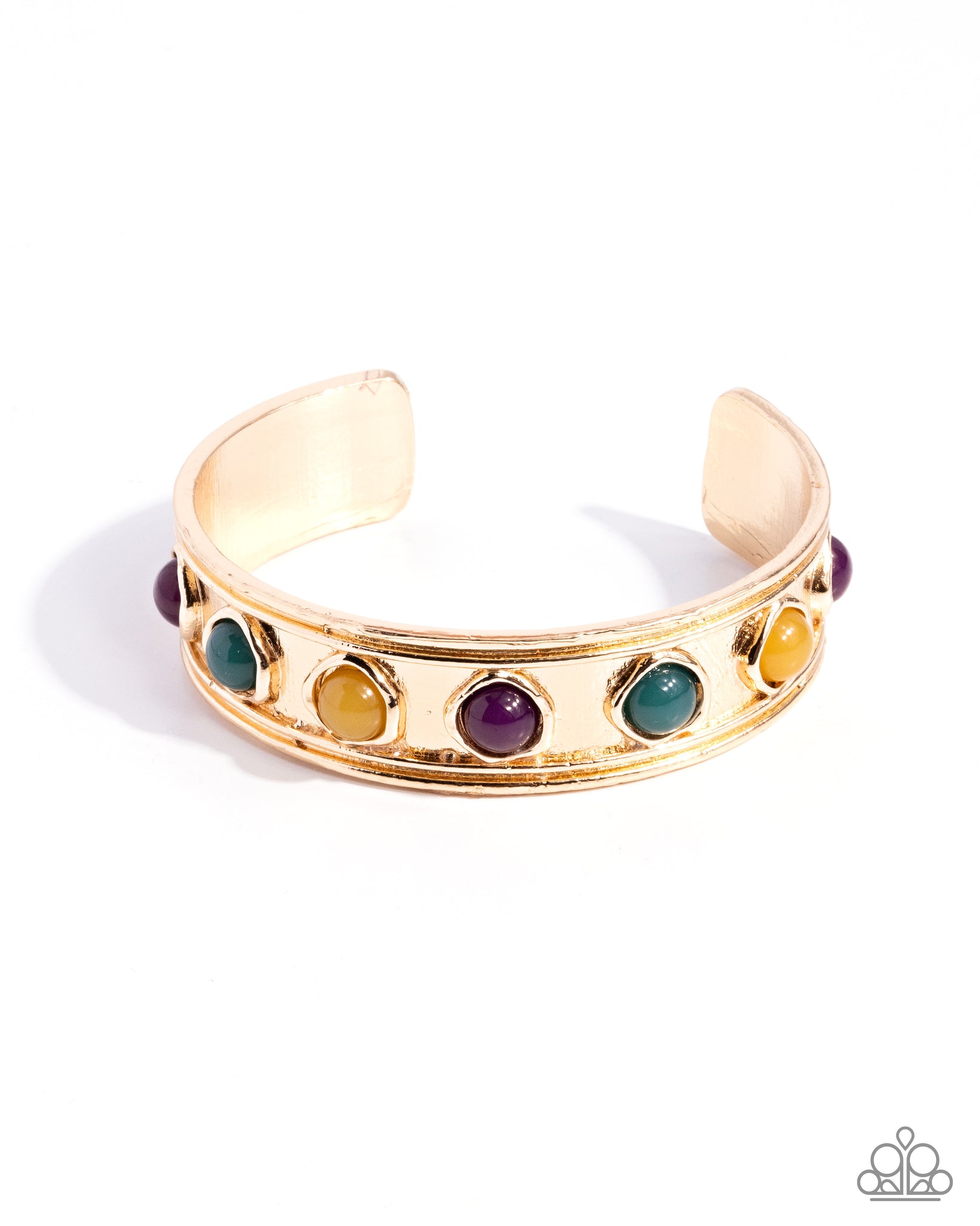 A gold cuff bracelet featuring an arrangement of round stones in Aventurine, Golden Palm, and Italian Plum. The colorful stone elements are evenly spaced along the gold cuff, creating a vibrant yet classic design. As the stone elements in this piece are natural, some color variation is normal.