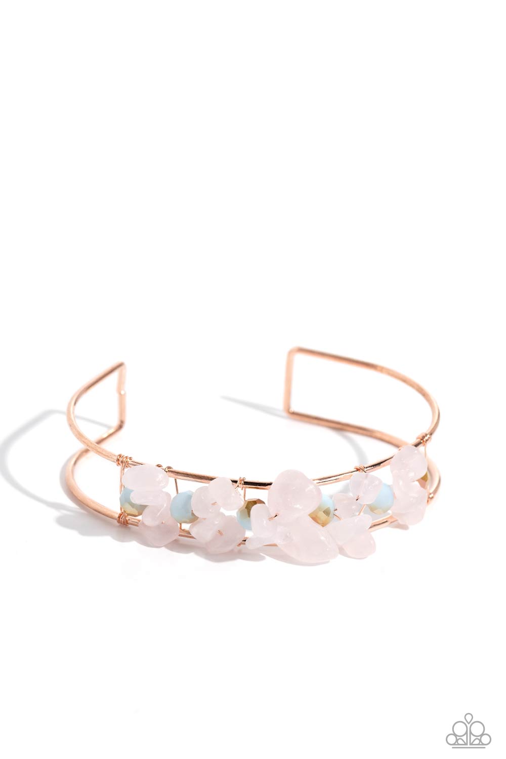 An earthy collection of chiseled rose quartz stones and blue beads brushed in a reflective gold shimmer are wrapped along the center of an airy shiny copper cuff by a shimmery shiny copper wire for a handcrafted finish. As the stone elements in this piece are natural, some color variation is normal.