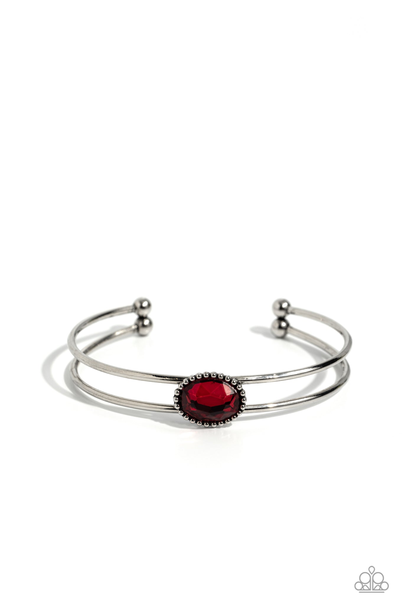 Encased in a studded silver frame, a fiery red gem sits atop a layered silver cuff, creating a mesmerizing centerpiece around the wrist.