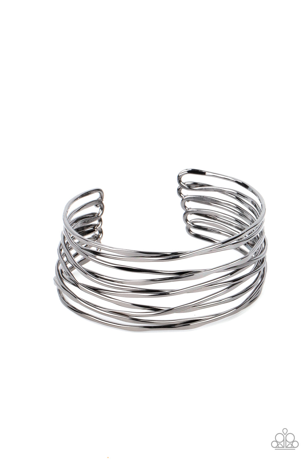 Featuring sections of flattened surfaces, glistening gunmetal wires crisscross across the wrist, coalescing into an intense industrial cuff.