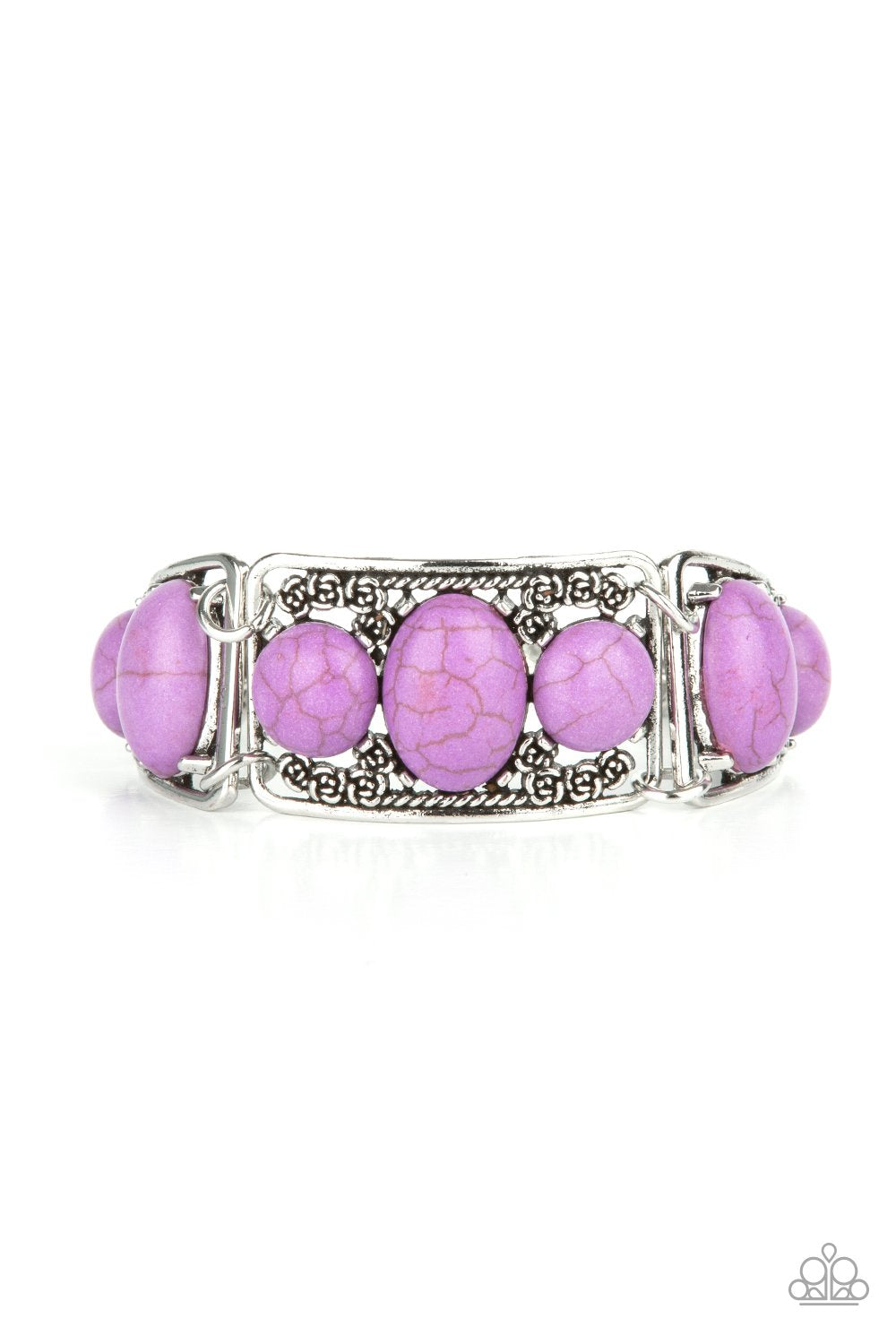 Purple oval stones are encrusted along the center of antiqued silver frames dotted with dainty rosebuds as they delicately connect into an adjustable cuff-like display around the wrist. Features an adjustable clasp closure.