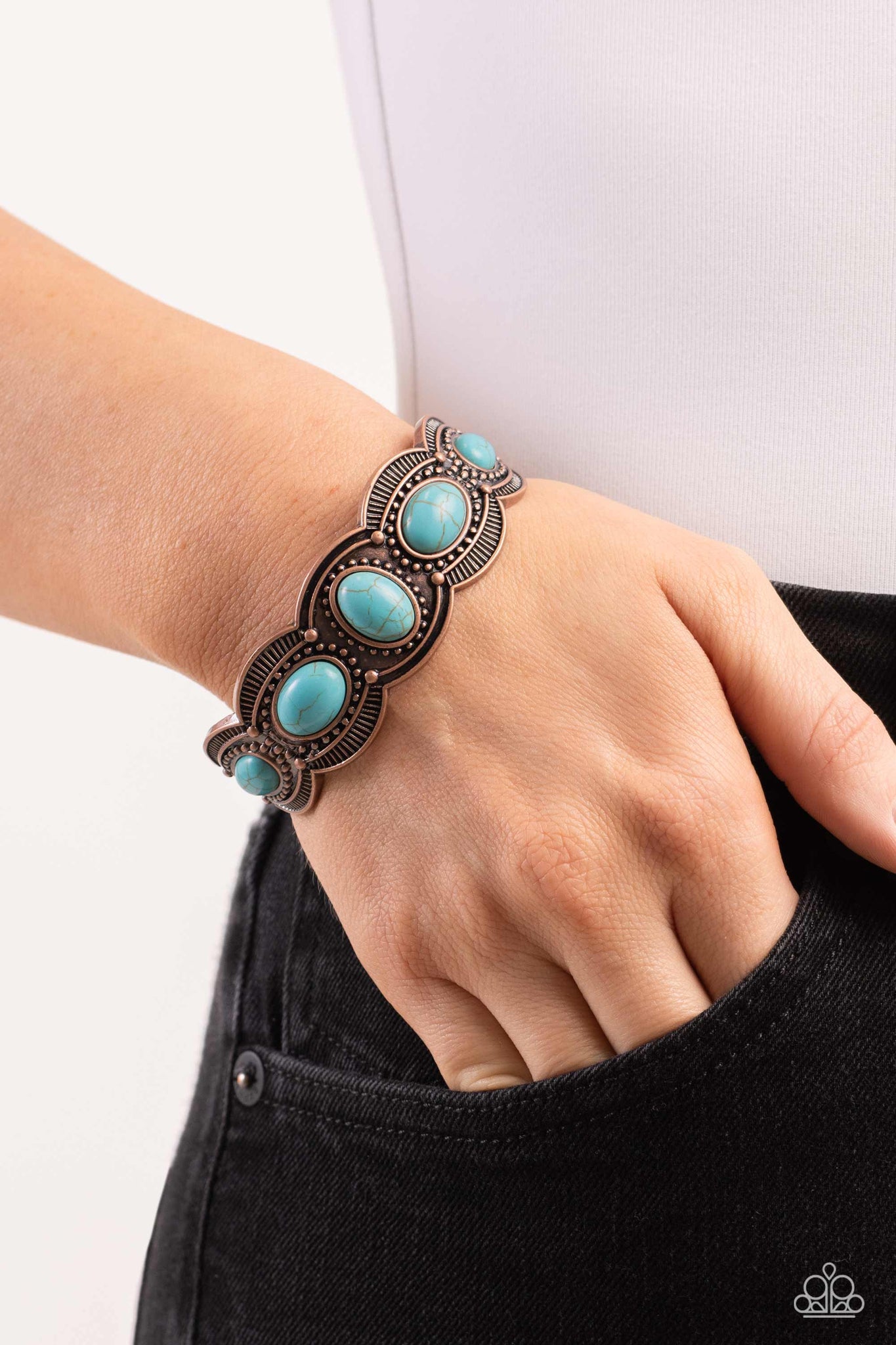Featuring earthy turquoise stones, an ornately textured and studded copper cuff wraps around the wrist for an artisan-inspired look. As the stone elements in this piece are natural, some color variation is normal.