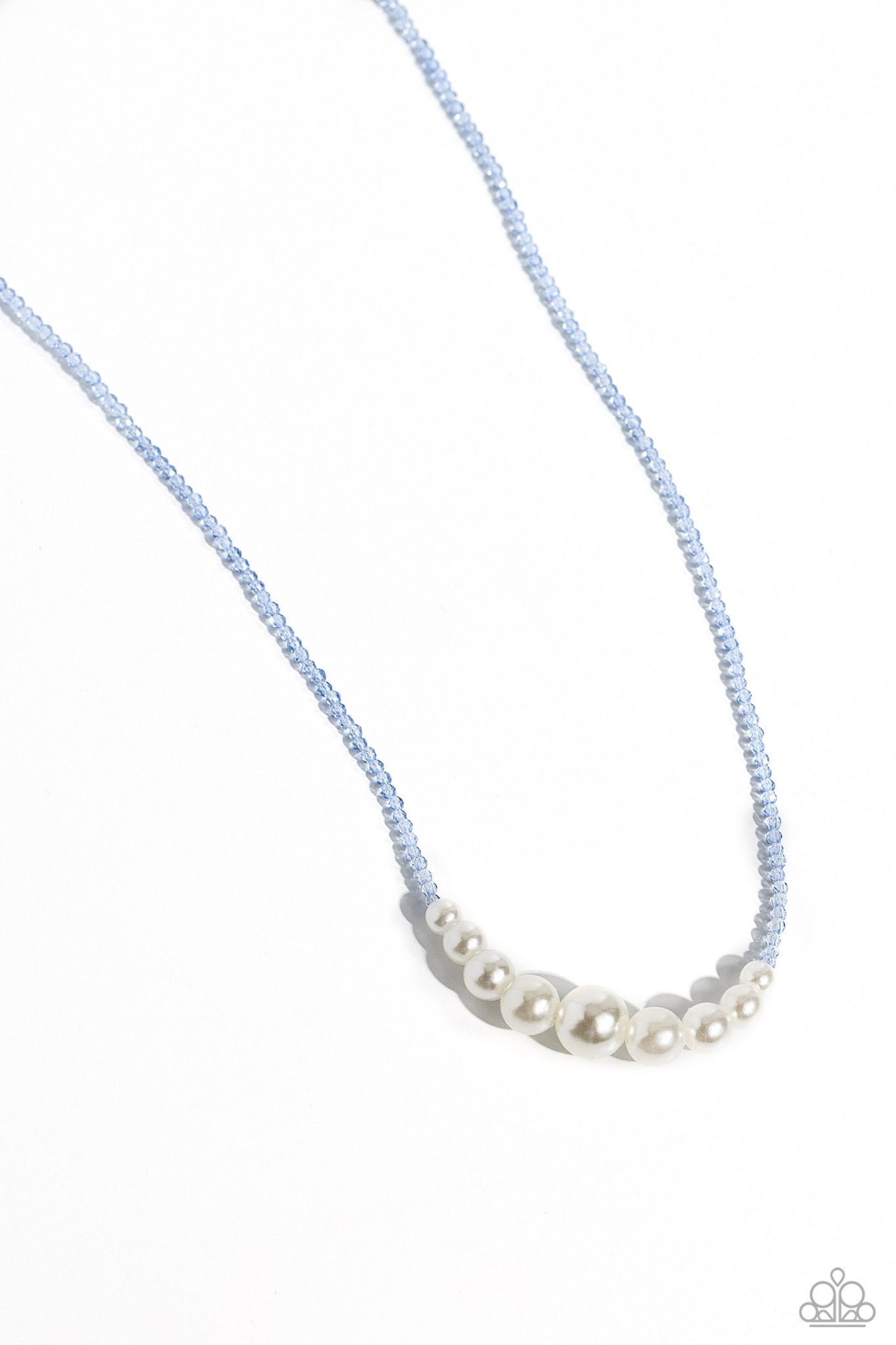 Gradually increasing in size near the center, glossy white pearls stand out against dainty, glistening, glassy blue beads that are threaded along an invisible wire below the collar for a refined finish. Features an adjustable clasp closure.