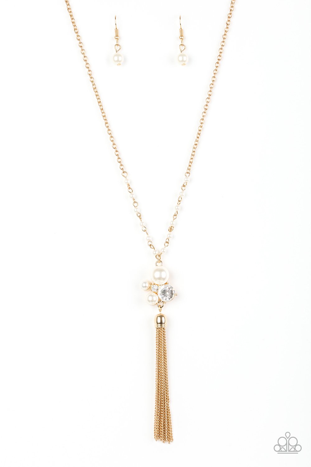 Varying in size and shimmer, pearly white beads and glittery white rhinestones coalesce into a clustered pendant at the bottom of a shimmery gold chain. Infused with dainty white pearls, the sparkling pendant gives way to a glistening gold tassel for a flirty finish. Features an adjustable clasp closure.