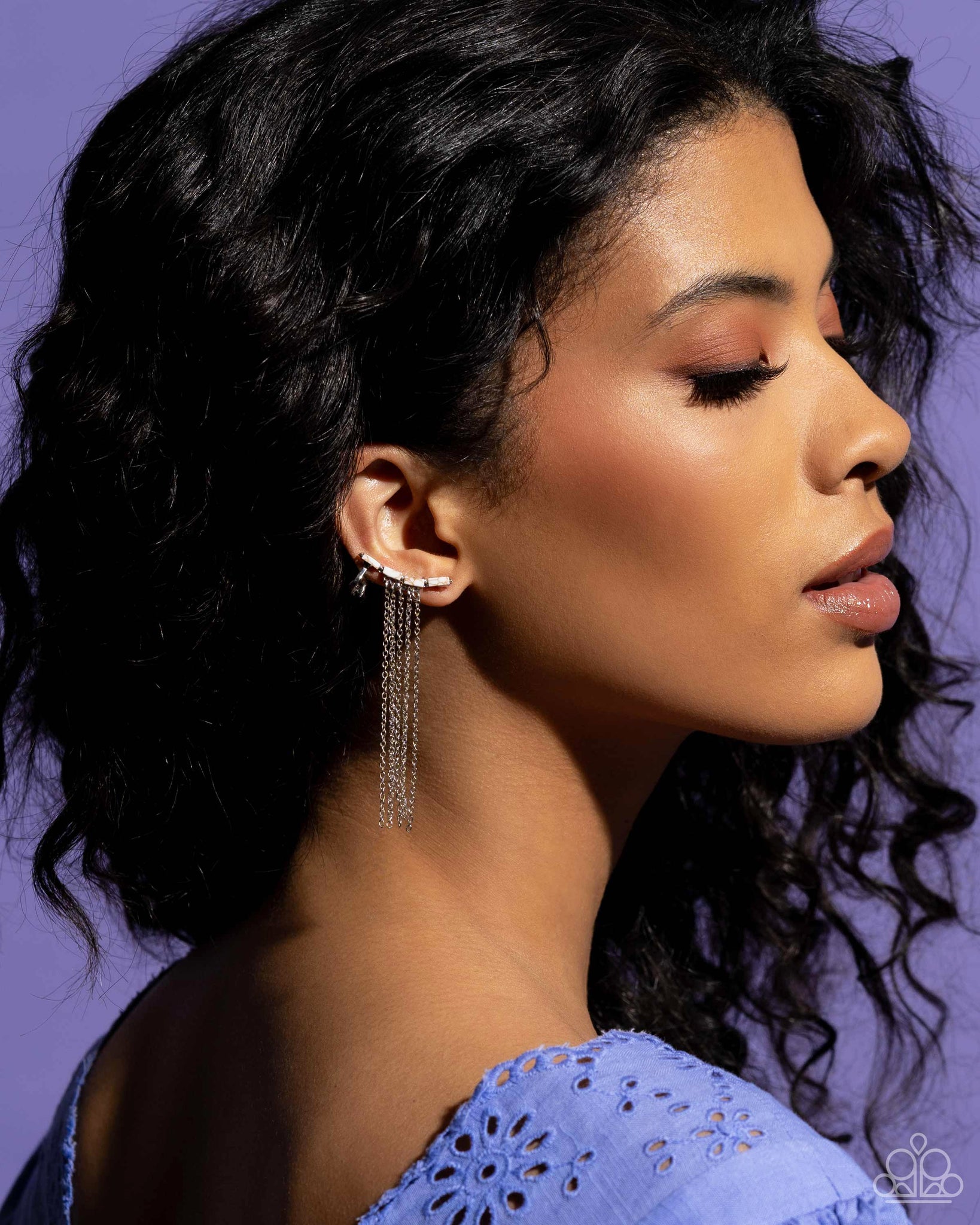 A fringe of dainty silver chains cascades from the edge of a curving white stone and stud-encrusted frame, creating an earthy centerpiece. Features an extended post fitting that climbs the back of the ear and can be pressed together for a more secure fit.