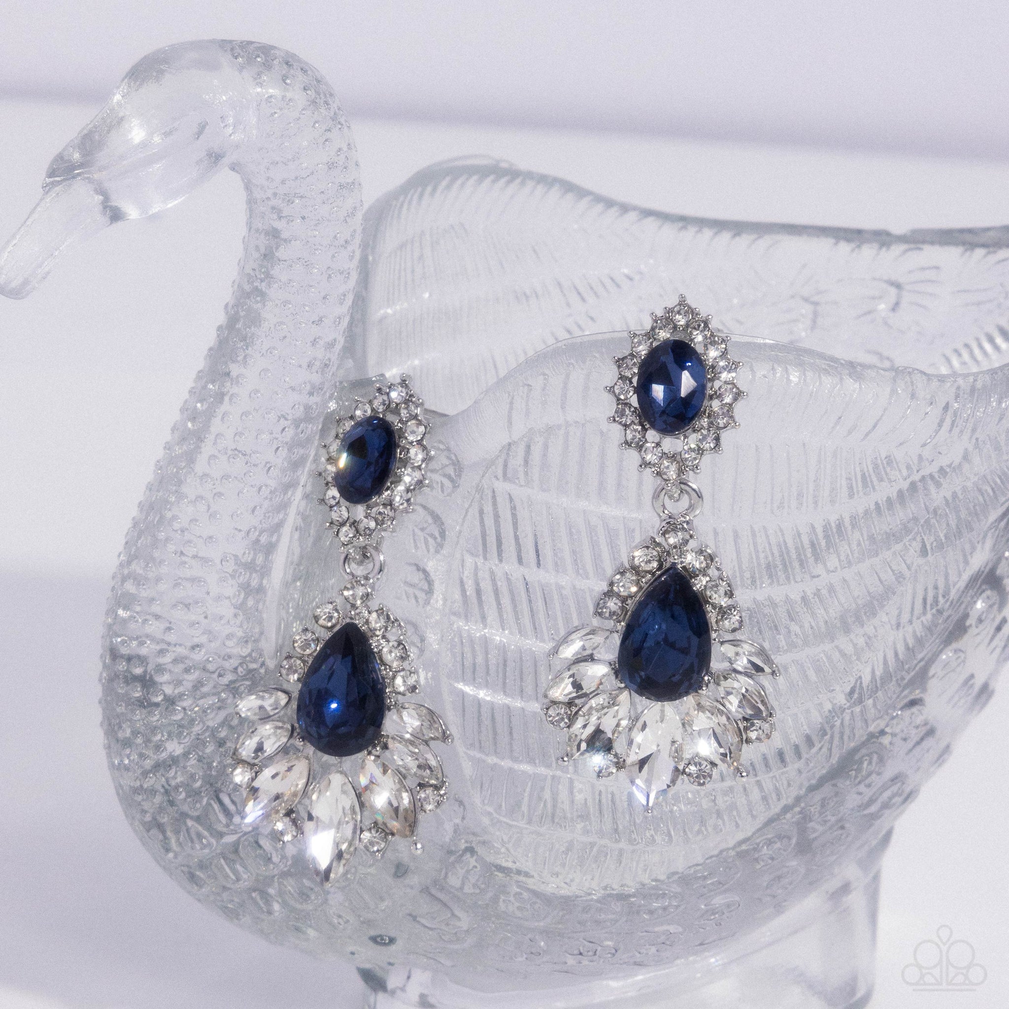 Pressed in intricately woven interconnected silver frames, glistening blue oval and teardrop gems sway below the ear for a pop of refined color. Each of the airy silver frames is embellished with white rhinestones while the lowermost frame features marquise-cut white gems that gradually increase in size for a light-reflecting luminous finish. Earring attaches to a standard post fitting.