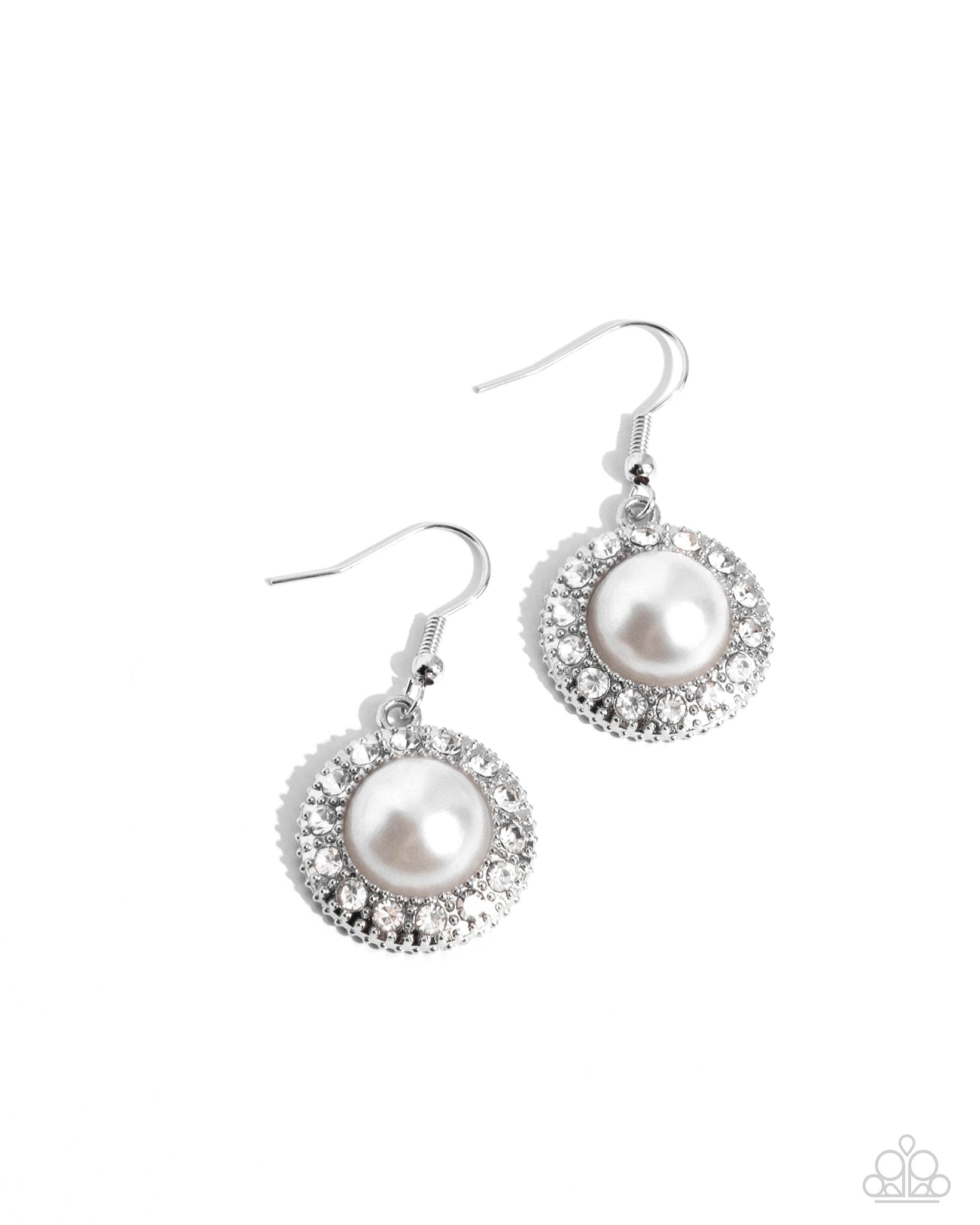An oversized pearly white bead is pressed into a circular silver frame radiating with glassy white rhinestones for a timeless look. Earring attaches to a standard fishhook fitting.
