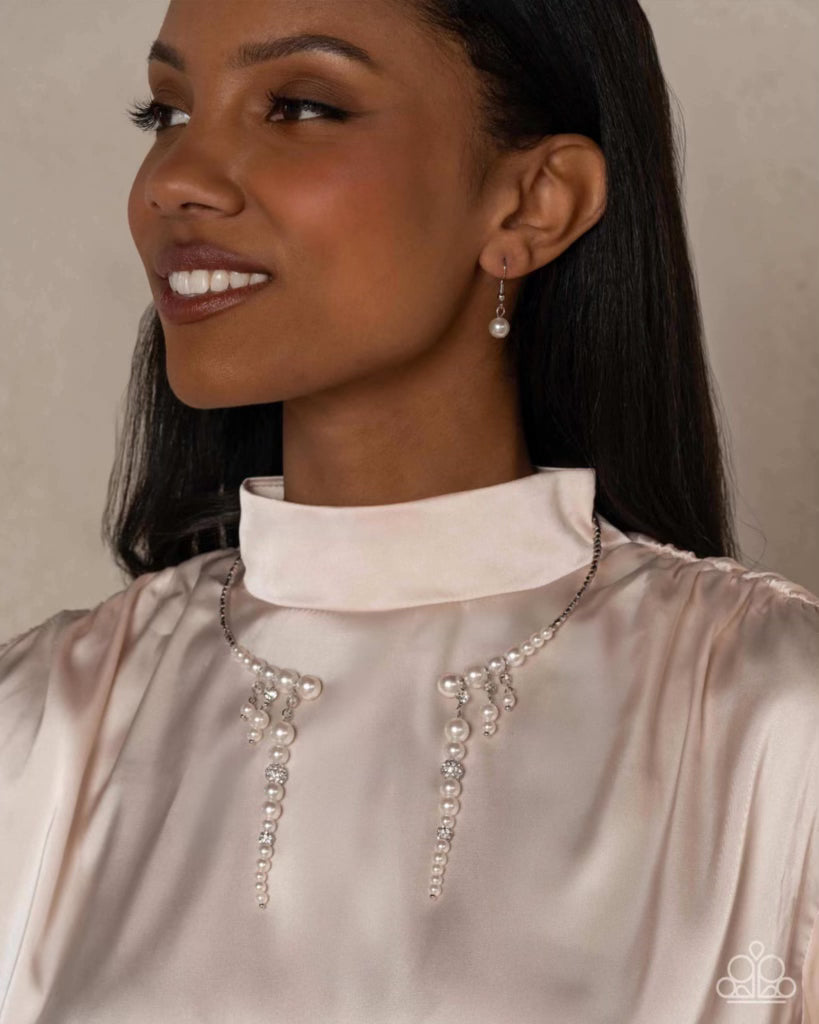 Threaded along a flexible wire that coils halfway around the neckline, faceted silver beads are joined by glossy white pearls that gradually increase in size towards the collarbone, creating a refined display. Strands of dainty white rhinestones in pronged silver fittings, additional pearls in varying sizes, and silver ornaments dusted in dainty white rhinestones dramatically sway between the centermost pearls for a fanciful fringed finish. Features an open-ended design.