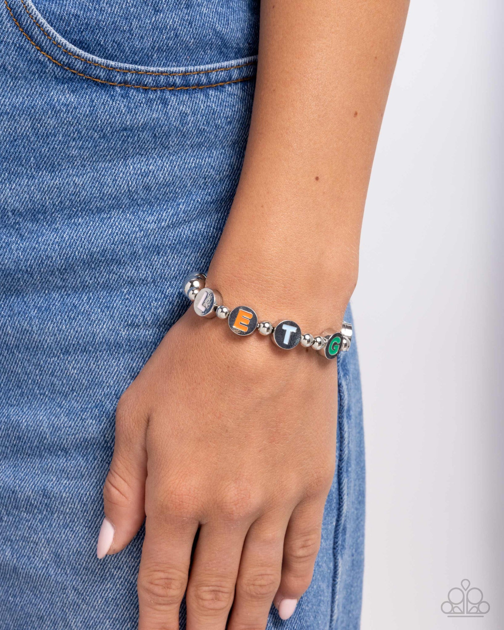 Infused on an elastic stretchy band, silver beads in varying sizes and flattened silver beads with multicolored letters spelling out the words "Let Go" stand out atop the center of the wrist for a youthful, inspiring display.