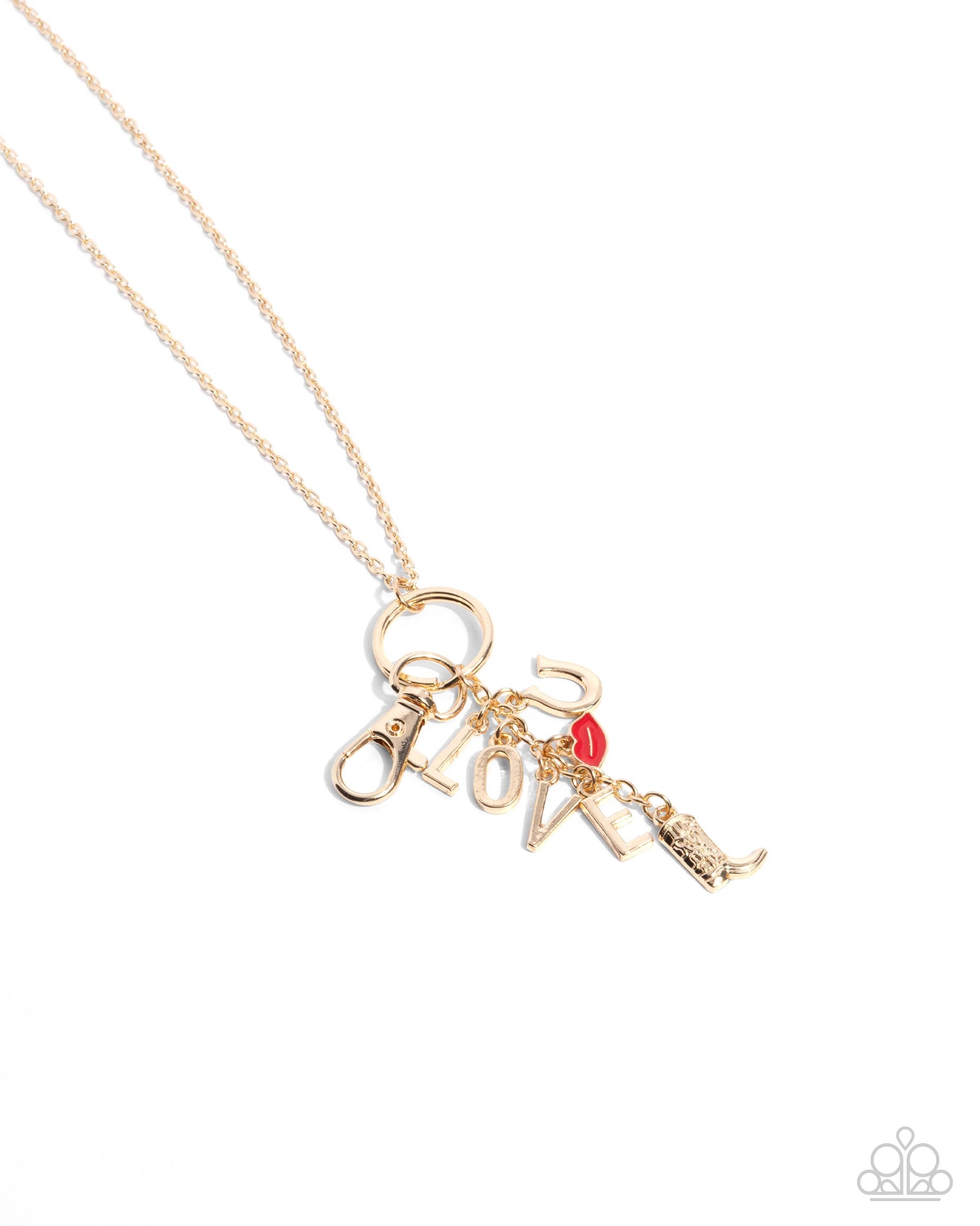 Swinging from a glistening gold hoop, a collection of trendy shapes, including a red-painted pair of lips, a gold horseshoe, a detailed gold cowboy boot, and the word "LOVE," cascades from the bottom of a lengthened gold chain. A gold lobster clasp hangs from the bottom of the design to allow a name badge or other item to be attached. Features an adjustable clasp closure.