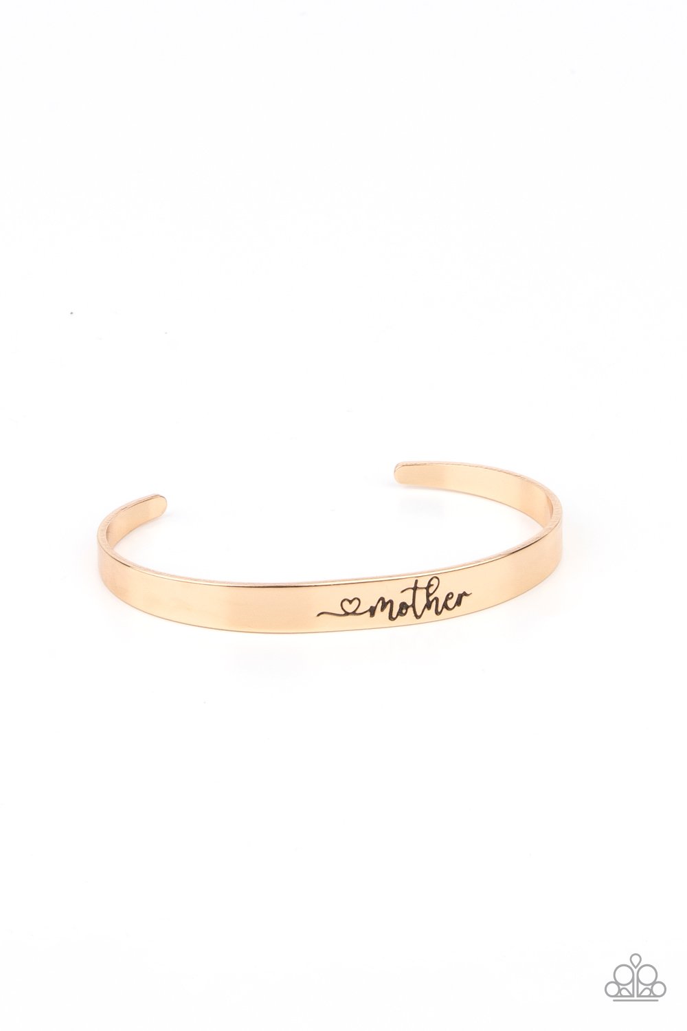 A dainty gold cuff is stamped in a heart and the word, "Mother," creating a sentimental centerpiece around the wrist.