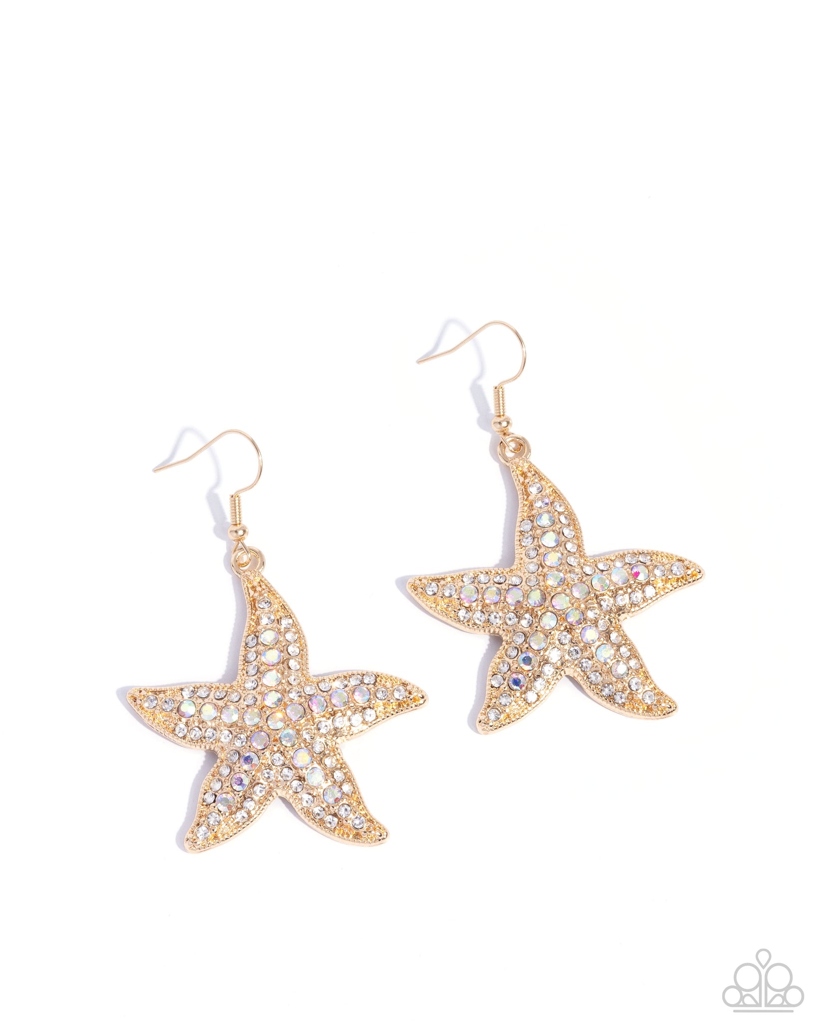 Shimmering with iridescent and white rhinestones, the gold starfish frames exude coastal charm. The textured golden finish and sparkling rhinestone accents create a dazzling seaside-inspired look. Earring attaches to a standard fishhook fitting.