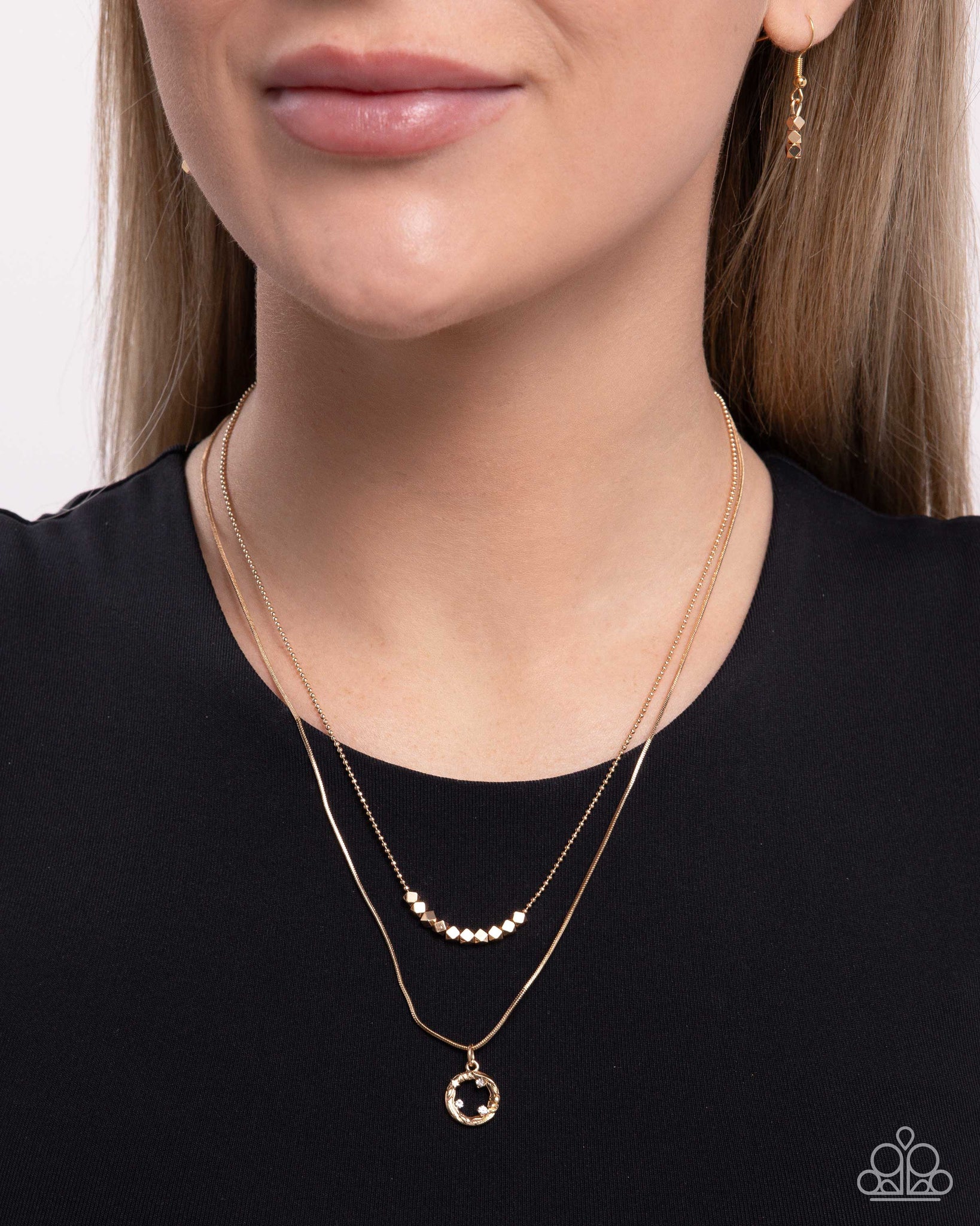 Infused along the center of a dainty gold ball chain, a collection of defaced beads glistens below the neckline. A white rhinestone-embellished abstract gold hoop glides along a dainty gold snake chain that is layered below the defaced strand for additional refinement and glitz. Features an adjustable clasp closure.