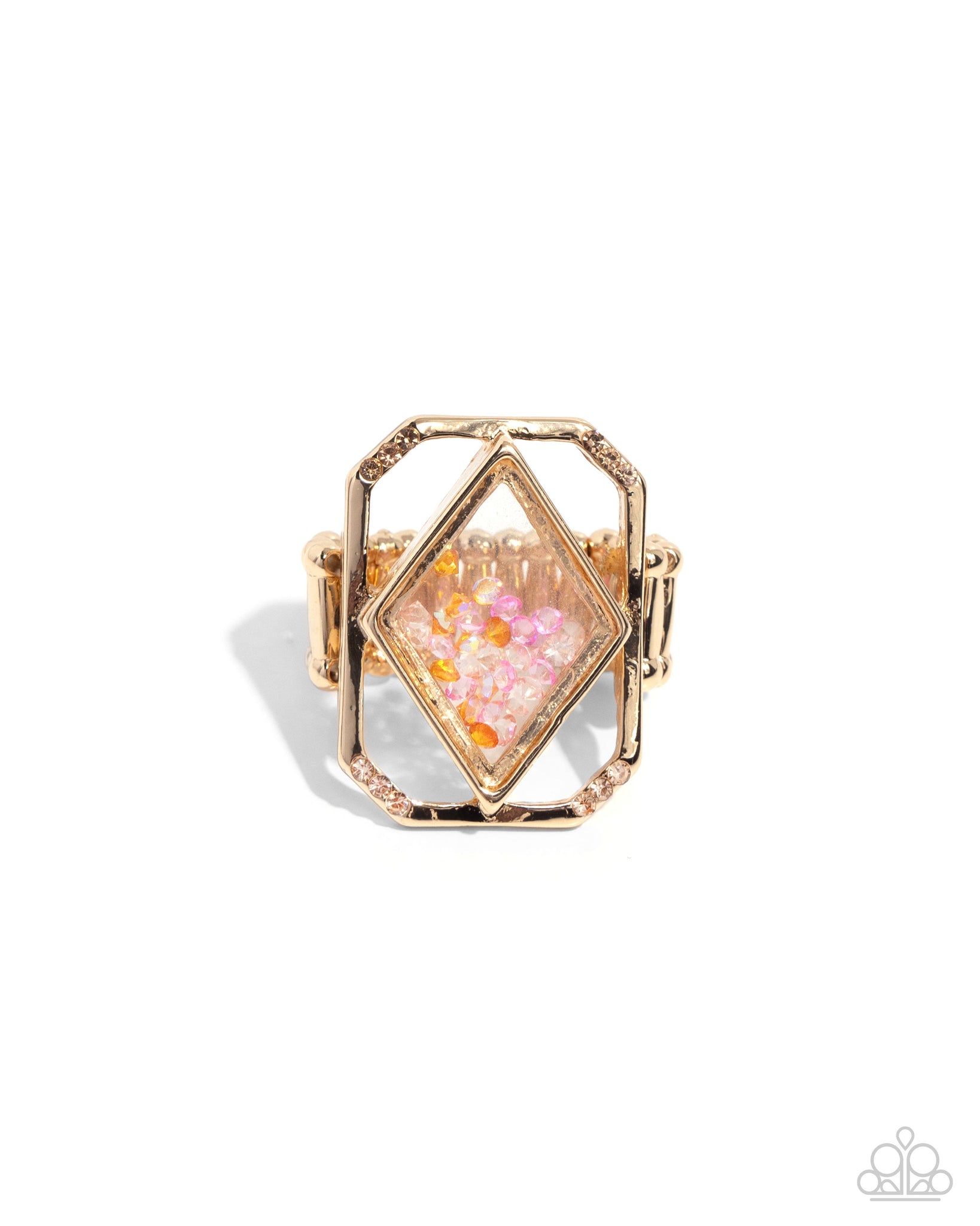 A collection of light rose, light peach, and iridescent topaz crystal beads are encased inside a glassy, diamond-cut gold casing that is pressed into an emerald-cut airy frame, creating a standout, colorful centerpiece. Trios of various peach rhinestones are encrusted along each corner of the emerald-cut frame for additional shimmer. Features a stretchy band for a flexible fit. Due to its prismatic palette, color may vary.