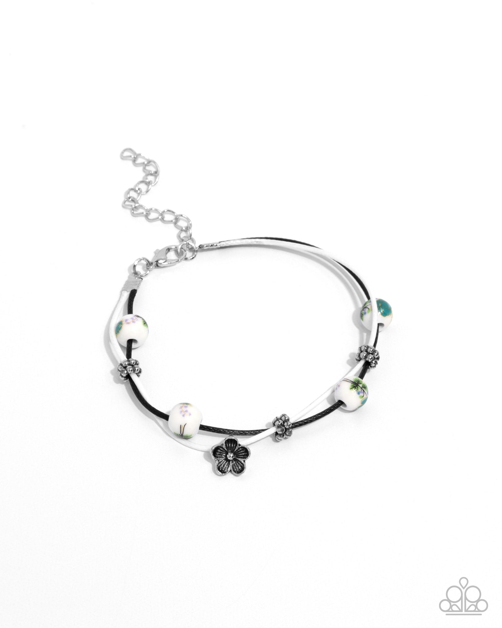 Infused along black and white strings, a collection of floral-painted white beads, silver wheel beads, and a solitaire silver flower glisten atop the wrist for an eye-catching display. Features an adjustable clasp closure.