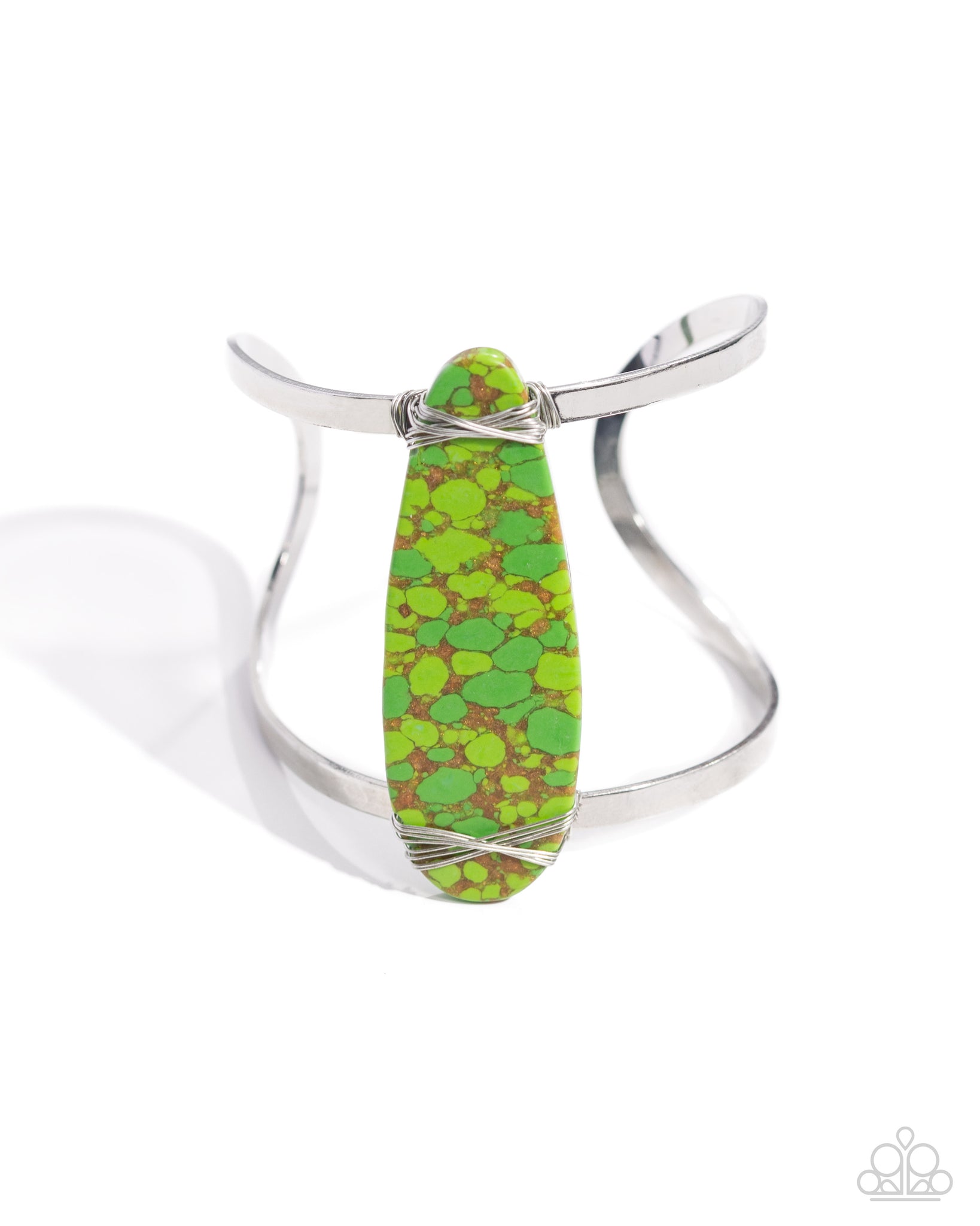 Chiseled into a tranquil extended oval, an oversized jade spotted stone is wrapped along the center of an airy silver cuff by shimmery silver wire for a handcrafted seasonal look. As the stone elements in this piece are natural, some color variation is normal.