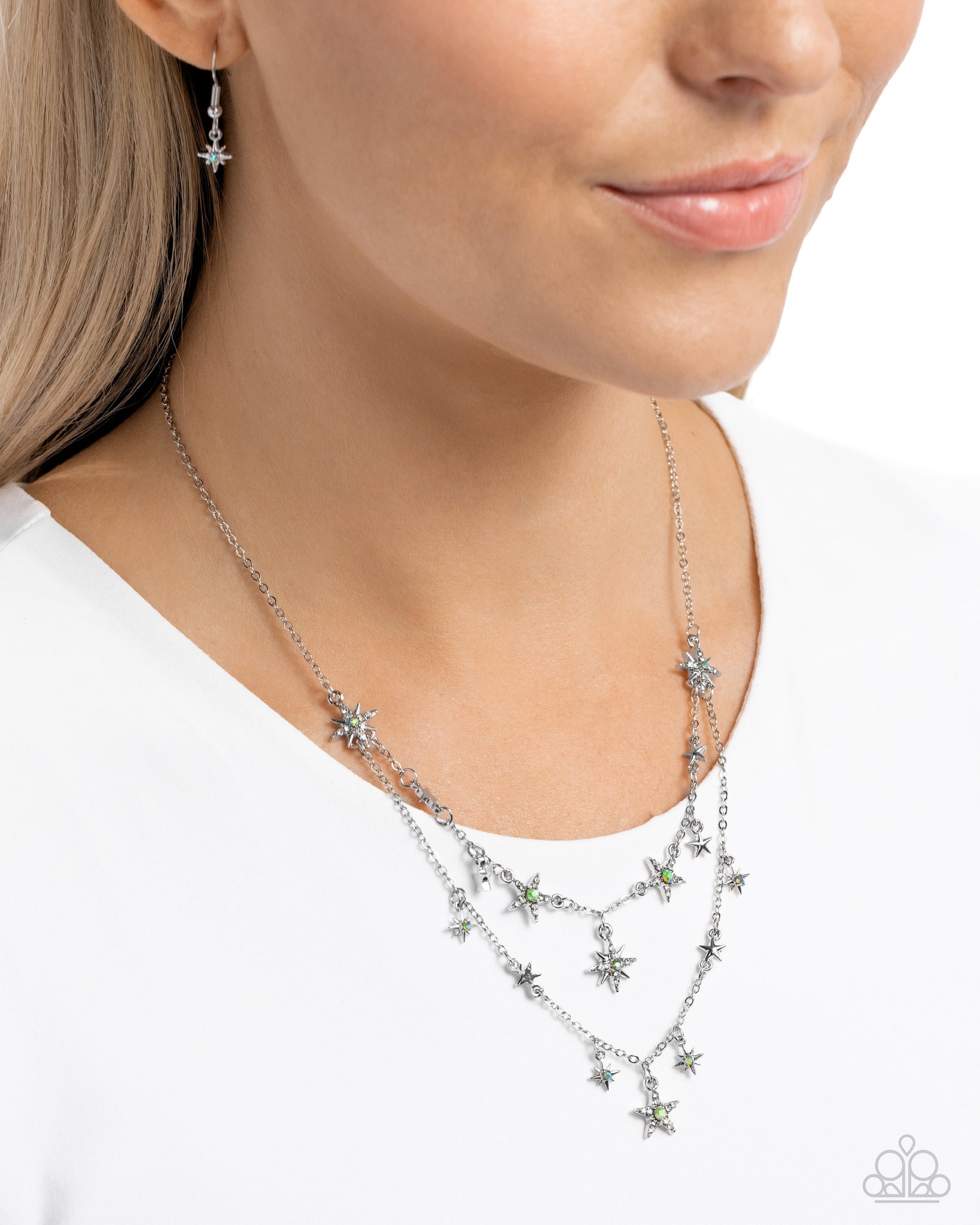 Haphazardly scattered across two dainty silver chains, a constellation of various silver stars, some with green iridescent centers, cascades below the neckline for a stellar finish. Features an adjustable clasp closure. Due to its prismatic palette, color may vary.