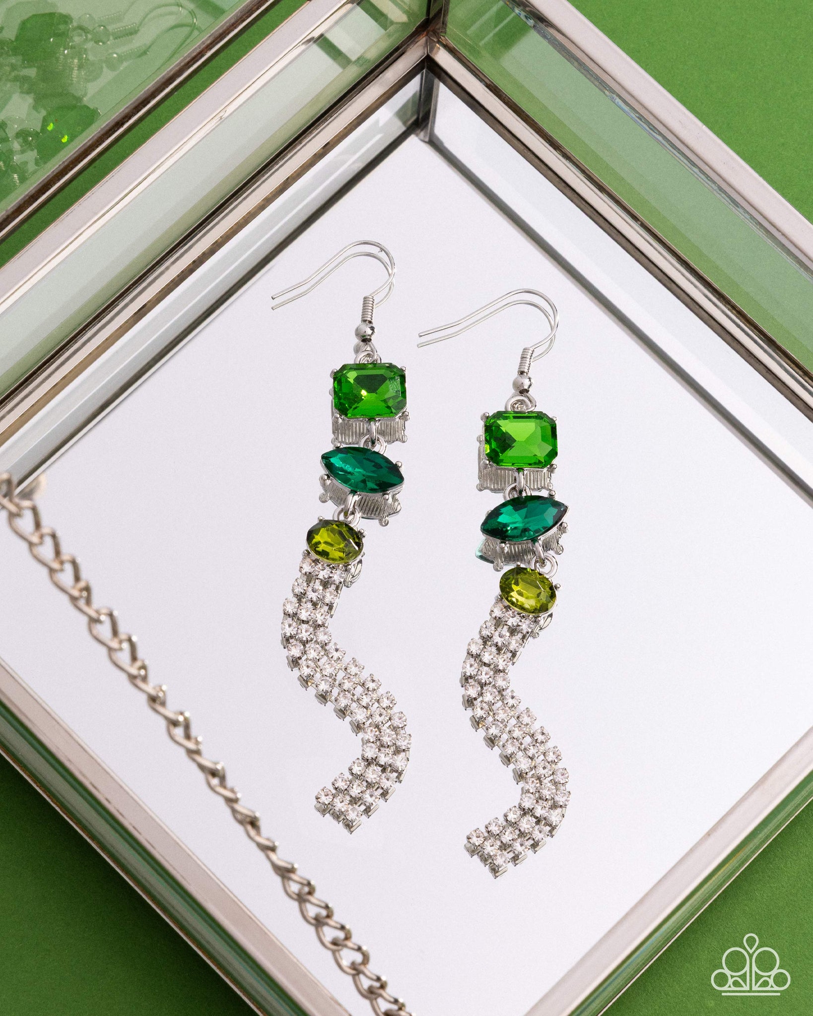 Pronged in silver fittings, a brilliant collection of green multicolored gems in emerald, marquise, and round cuts stream from the ear, creating a dramatic anchoring point from which streams a glittery, white rhinestone fringe for a glitzy finish. Earring attaches to a standard fishhook fitting.