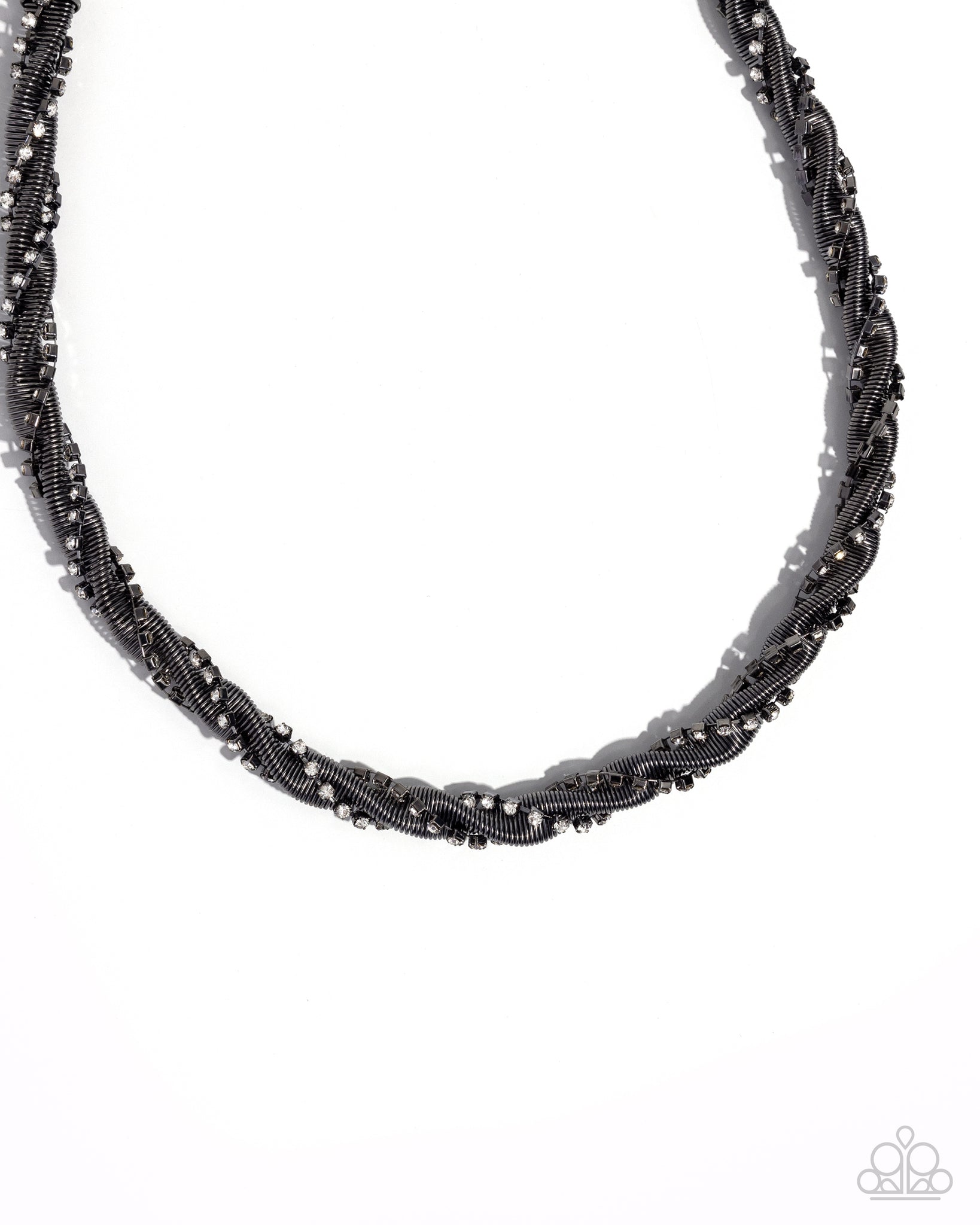 A gunmetal snake chain and a white rhinestone-encrusted dainty gunmetal box chain twists and coils along the neckline, layering into a sassy display of sparkle. Features an adjustable clasp closure.