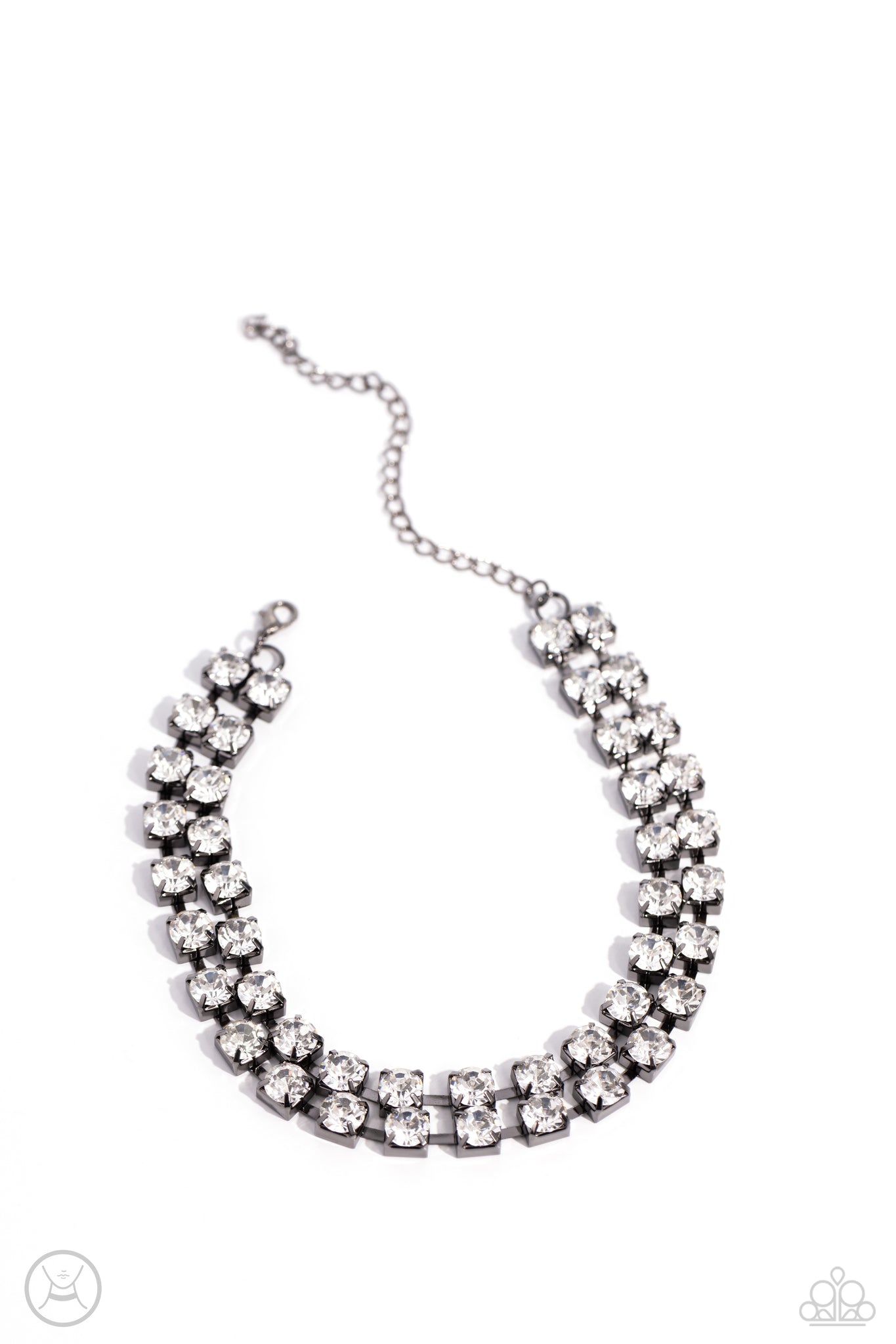 Featuring pronged gunmetal fittings, strands of oversized, glittery white rhinestones connect with rows of gunmetal box chains around the neck for a glittery twist. Features an adjustable clasp closure.