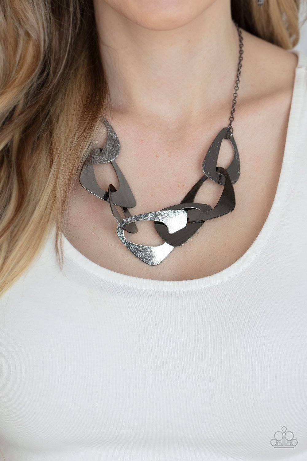 Large triangular cutouts stamped in a lightly dotted texture link below the collar forming a dramatic display of gunmetal slices. Features an adjustable clasp closure.