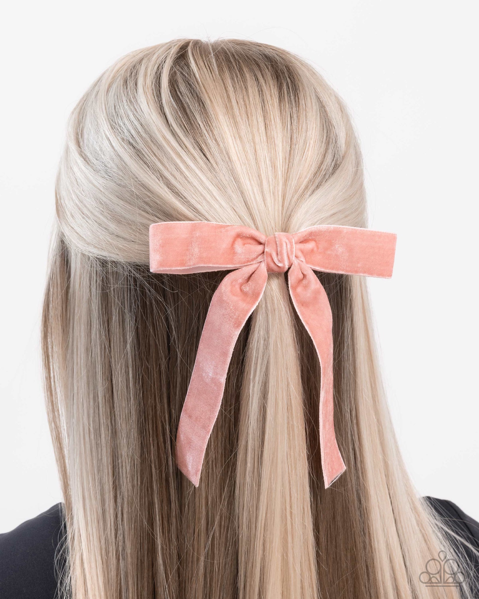 Featuring a velvet feel, a pink ribbon ties into an elongated elegant centerpiece. Features a standard hair clip on the back.