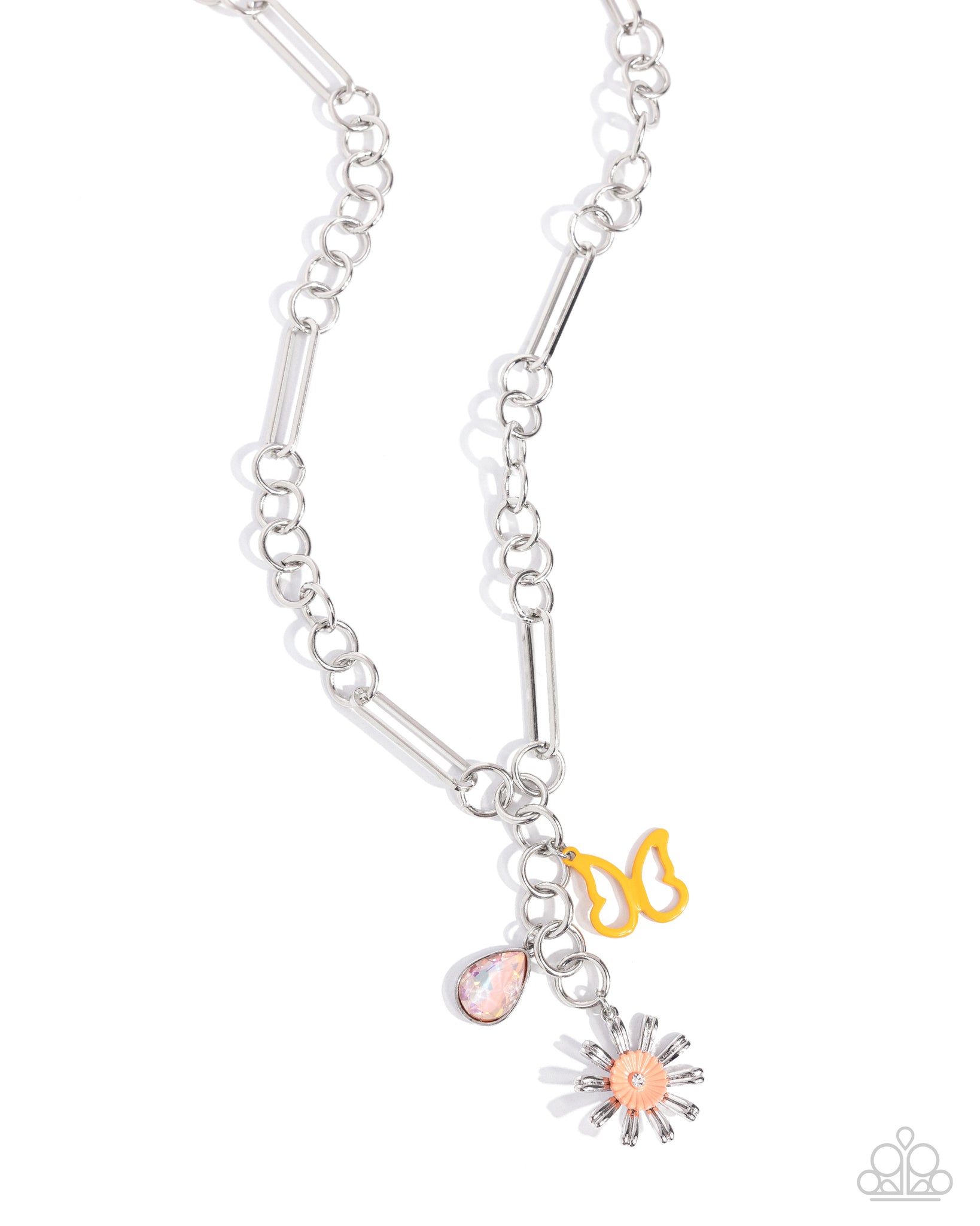 Cascading along an abstract silver chain, a collection of whimsical charms including an orange-painted butterfly silhouette, a Desert Flower-painted silver flower, and a silk orange teardrop gem extends below the neckline for a glittery finish. Features an adjustable clasp closure.