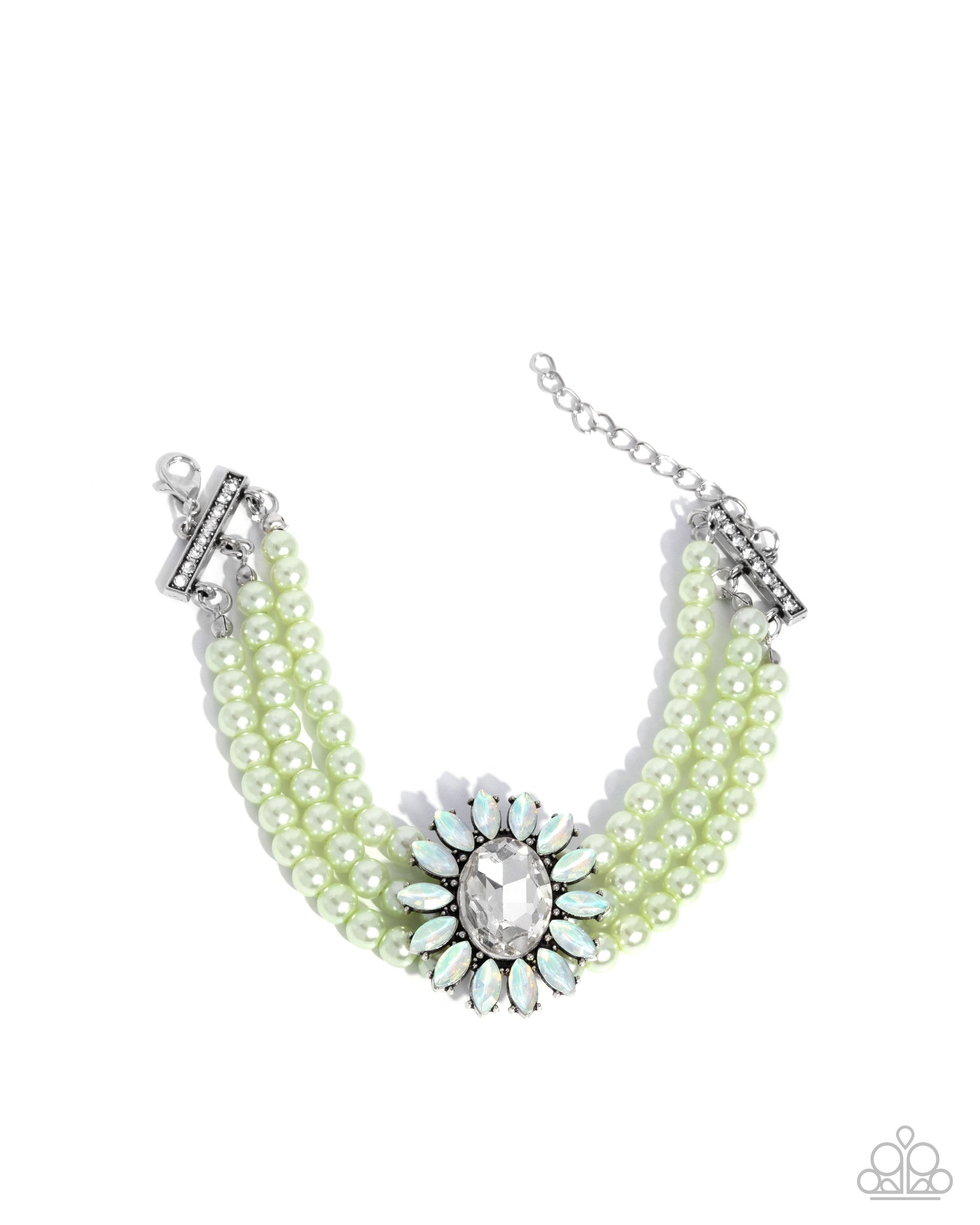 BRACELET: Perceptive Pearls • Green P9RE-GRXX-180JS: Pronged in silver fittings, an elegant explosion of marquise-cut green UV shimmery gem petals encircles a white oval gem delicately coalescing into a floral centerpiece. The refined ornament delicately holds together strands of glossy Lime Cream pearls that attach to silver horizontal fittings, creating romantically regal layers around the wrist. Features an adjustable clasp closure.