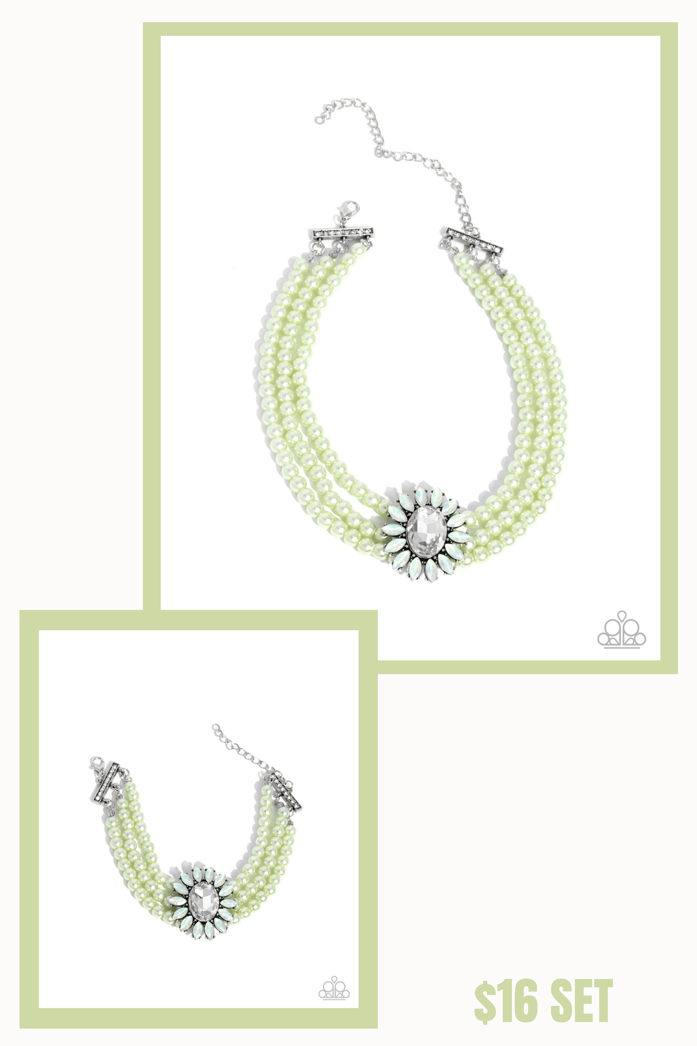 NECKLACE: Opulent Observation • Green P2CH-GRXX-038JS: Pronged in silver fittings, an elegant explosion of marquise-cut green UV shimmery gem petals encircles a white oval gem delicately coalescing into a floral centerpiece. The refined ornament delicately holds together strands of glossy Lime Cream pearls that attach to silver horizontal fittings, creating romantically regal layers around the collar. Features an adjustable clasp closure.