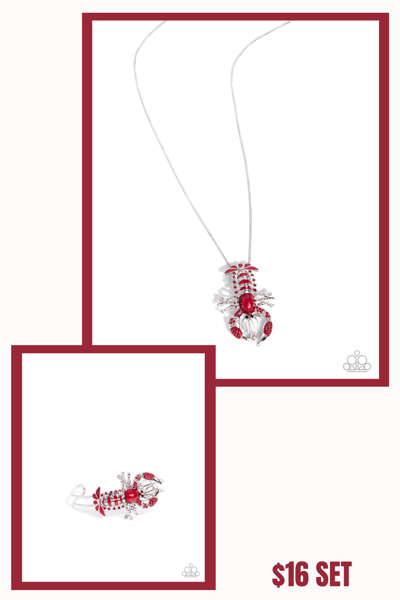 NECKLACE: Lobster Landmark • Red P2SE-RDXX-384KQ: Gliding along a silver snake chain, a transparent-painted red and silver lobster complete with black rhinestone eyes, light red rhinestone detailing, and sharp silver claws coalesces below the neckline for an opulent oceanic display. Features an adjustable clasp closure.