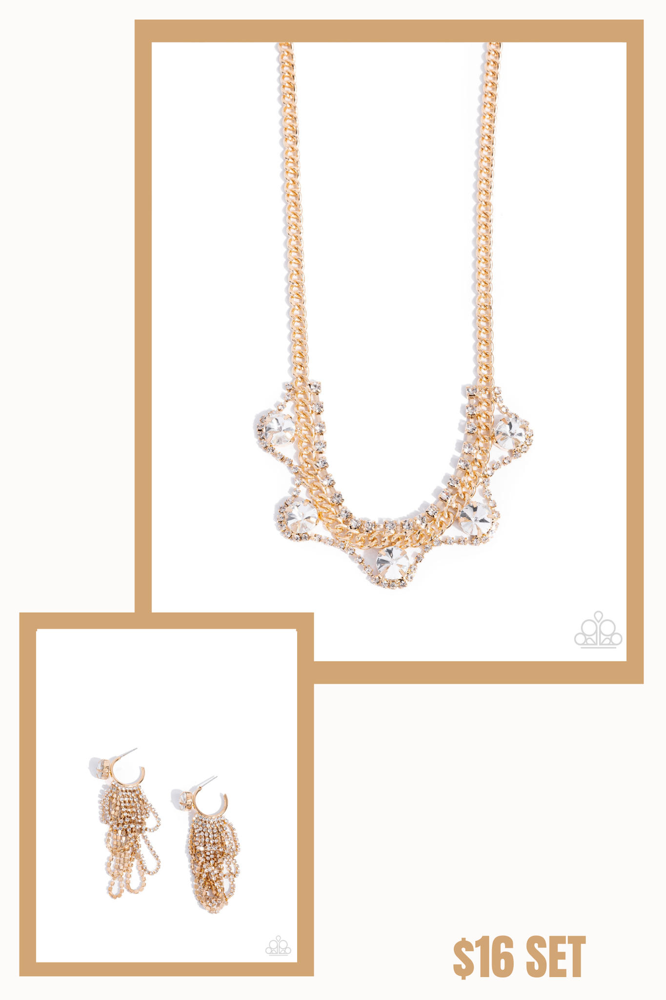 NECKLACE: A gold chain drapes elegantly along the neckline, adorned with oversized round white rhinestones that are encircled by smaller glittering rhinestones. The design creates a luxurious, glamorous display. Features an adjustable clasp closure.