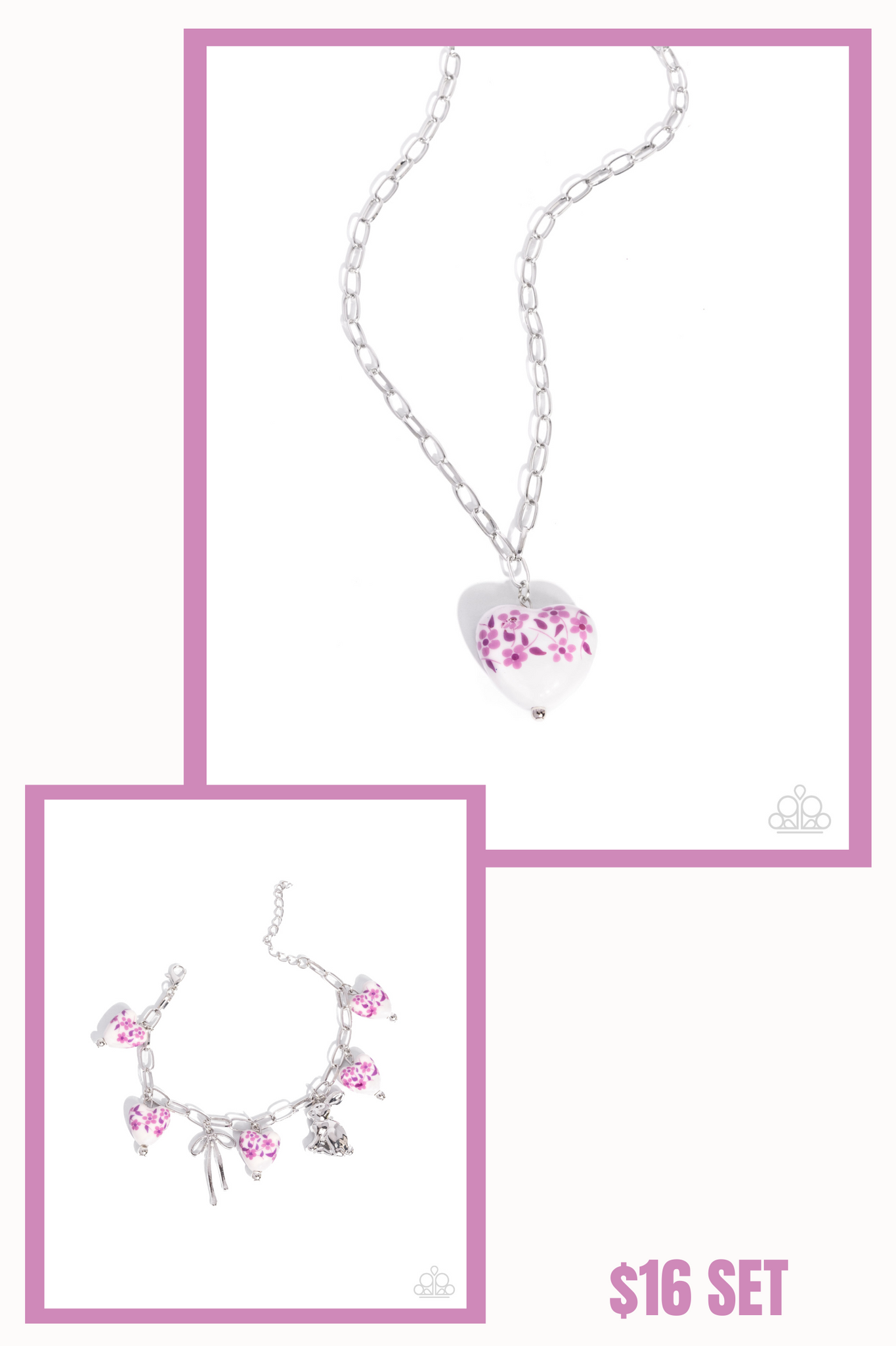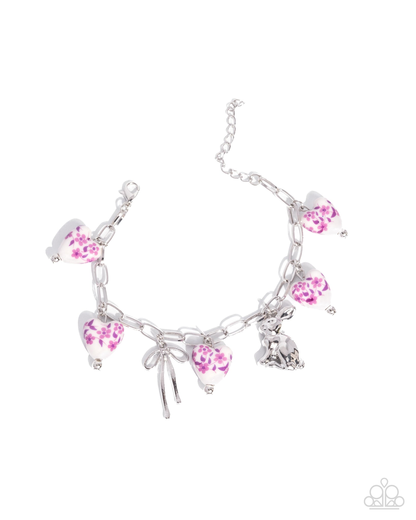 BRACELET: Painted Proficiency • Purple P9WH-PRXX-303JH: Modeled after porcelain, a collection of slightly pinched delicately painted white hearts with a purple floral pattern across their centers sway beside a silver rabbit and a silver bow around the wrist from a silver paperclip chain for a heartfelt, handmade statement. Features an adjustable clasp closure.