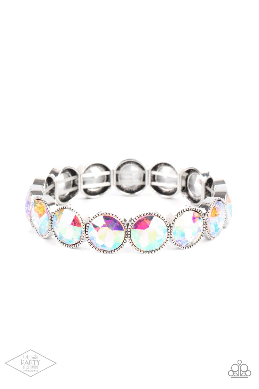 Faceted iridescent gems are pressed into sleek silver frames. The glittery frames are threaded along stretchy bands, creating a glamorous look around the wrist.