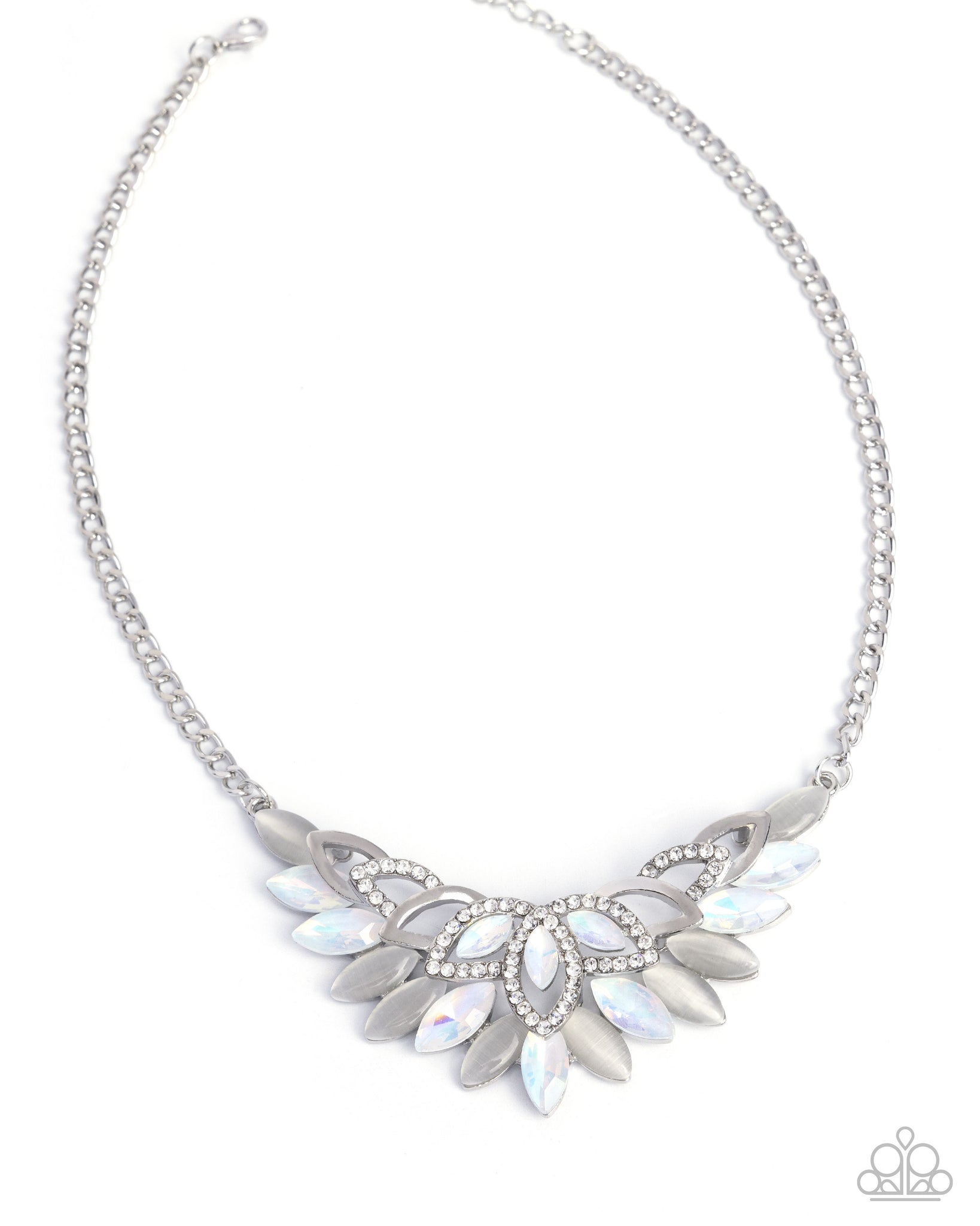 A silver chain showcases a dramatic fan of catseye marquise-shaped stones, alternating with radiant opalescent gems. Encased in dazzling silver frames lined with sparkling white rhinestones, the layered design creates a striking centerpiece. Features an adjustable clasp closure.