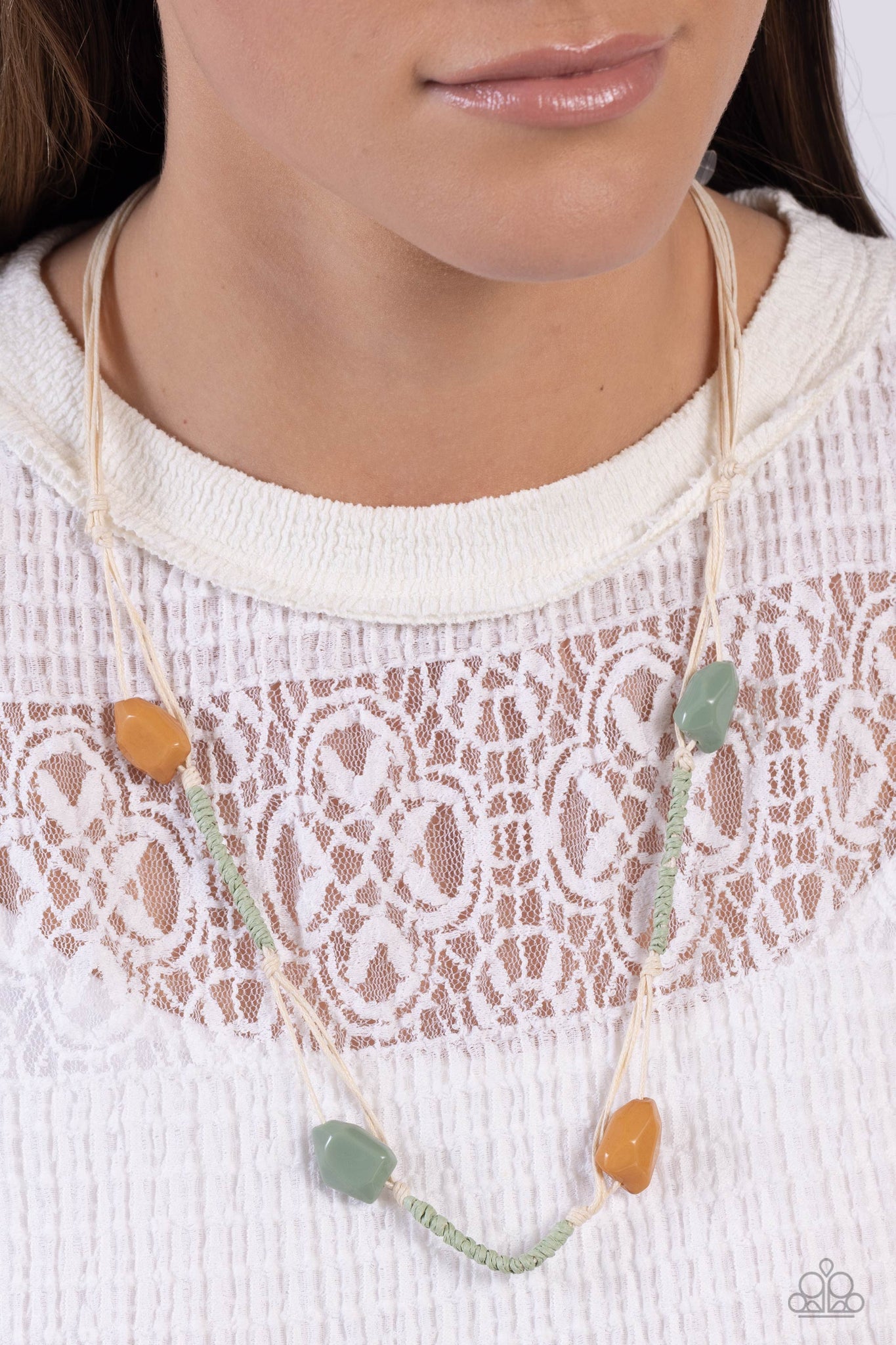 Faceted brown and Basil acrylic beads glide along knotted strands of white cording that are wrapped in Basil threaded accents, resulting in an earthy centerpiece. Features an adjustable sliding knot closure.