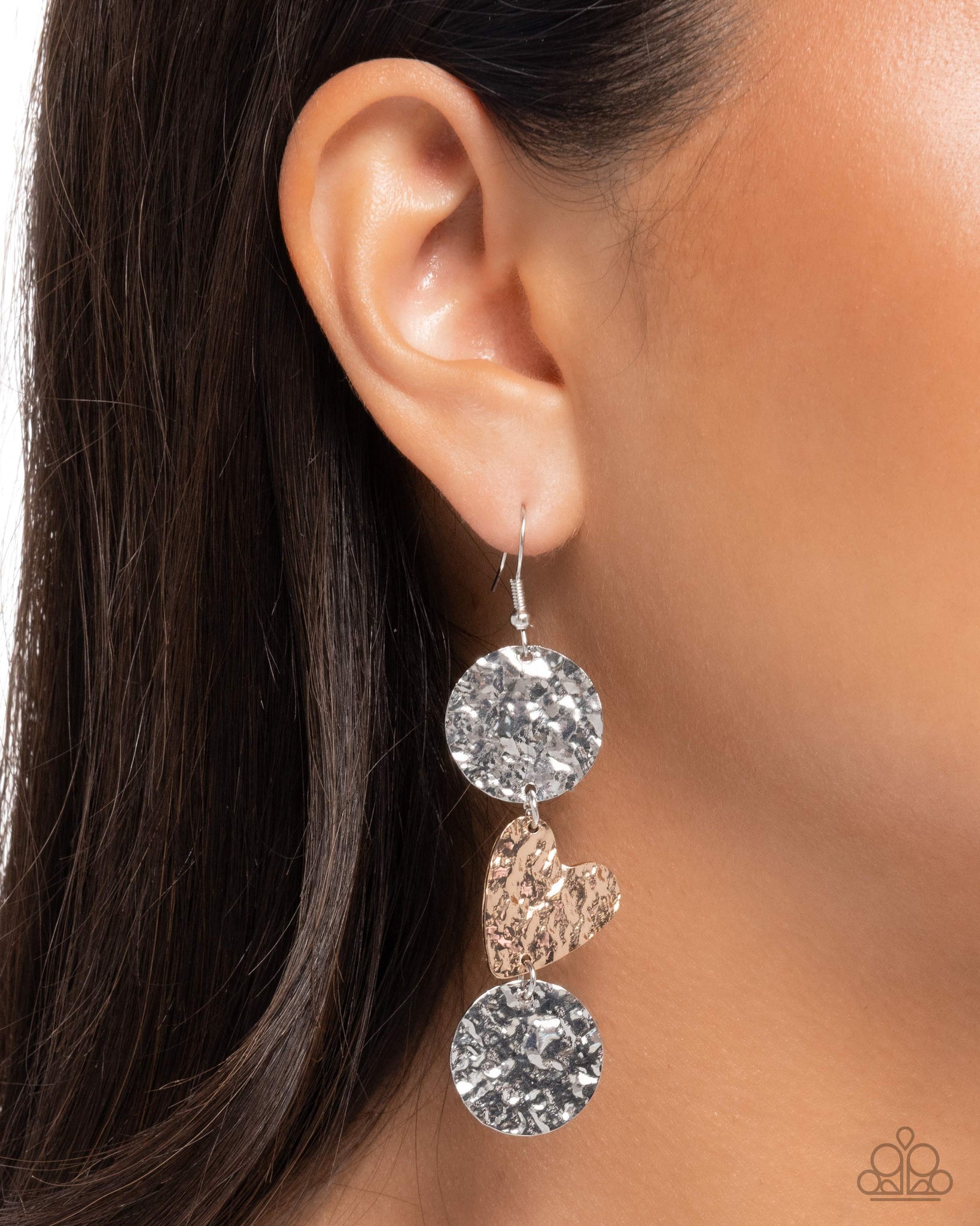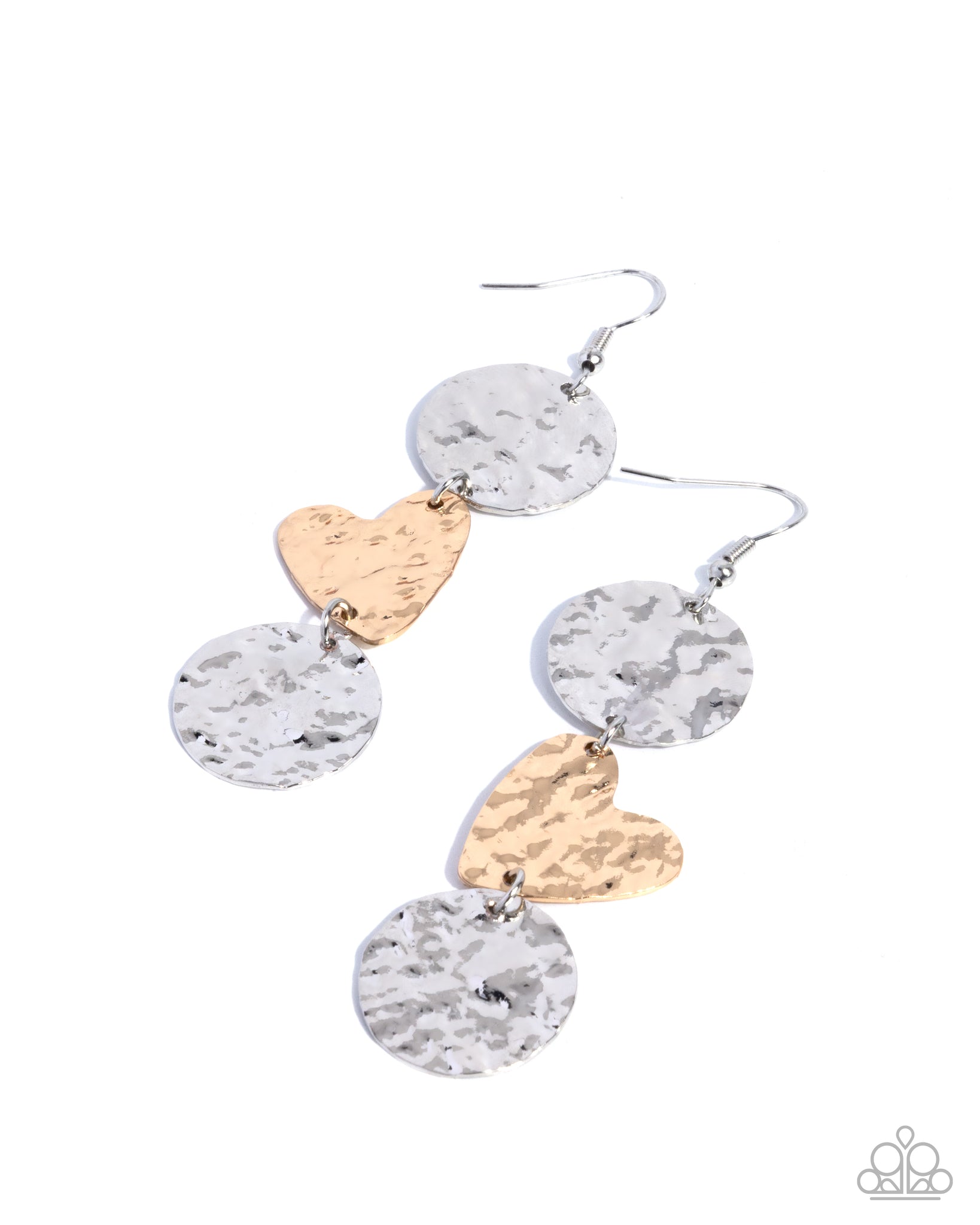 Featuring a slight tilt, heavily hammered silver round and gold heart discs delicately link and overlap into a ferociously flirty display. Earring attaches to a standard fishhook fitting.